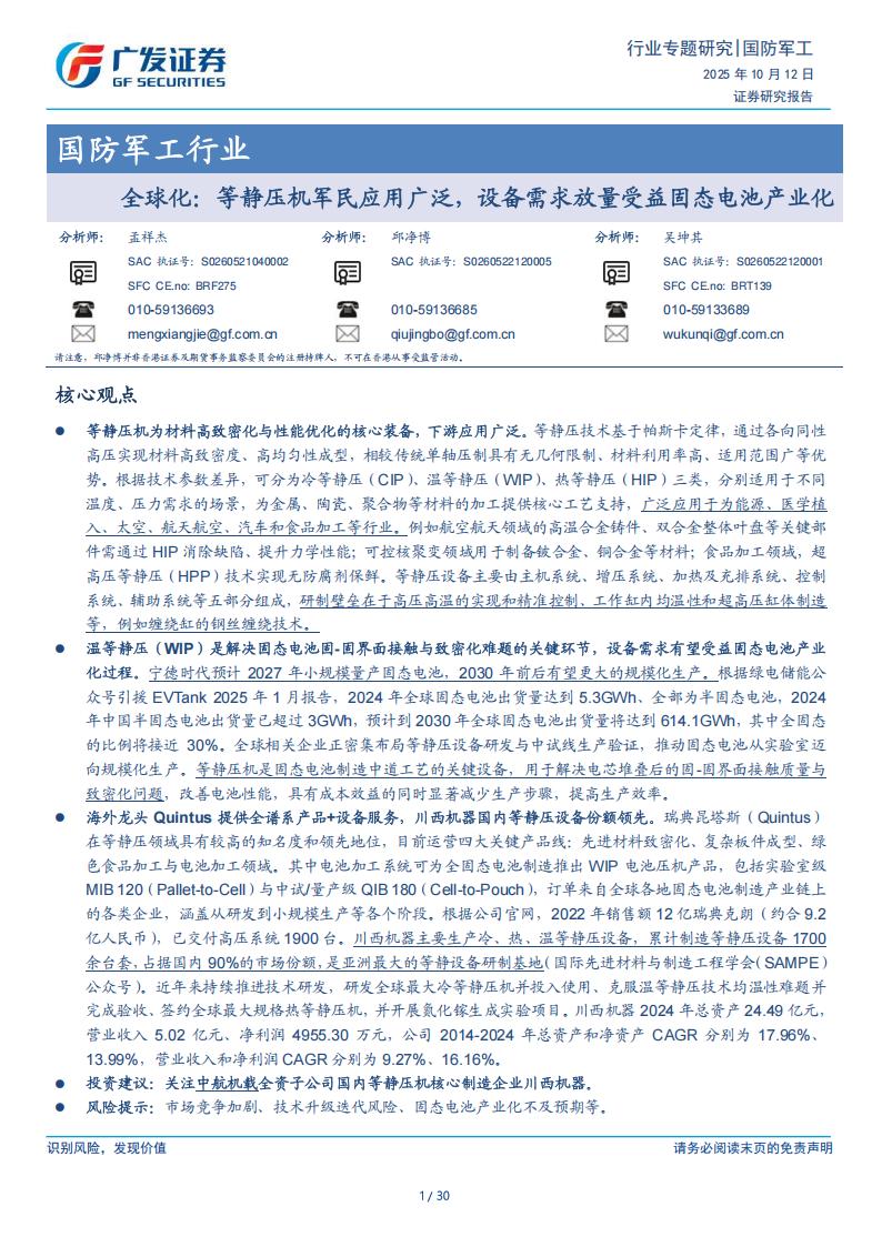 国防军工行业:全球化:等静压机军民应用广泛,设备需求放量受益固态电池产业化.pdf下载