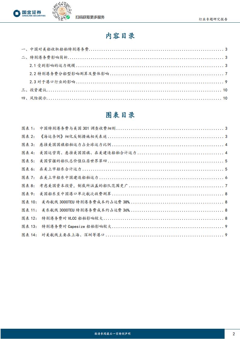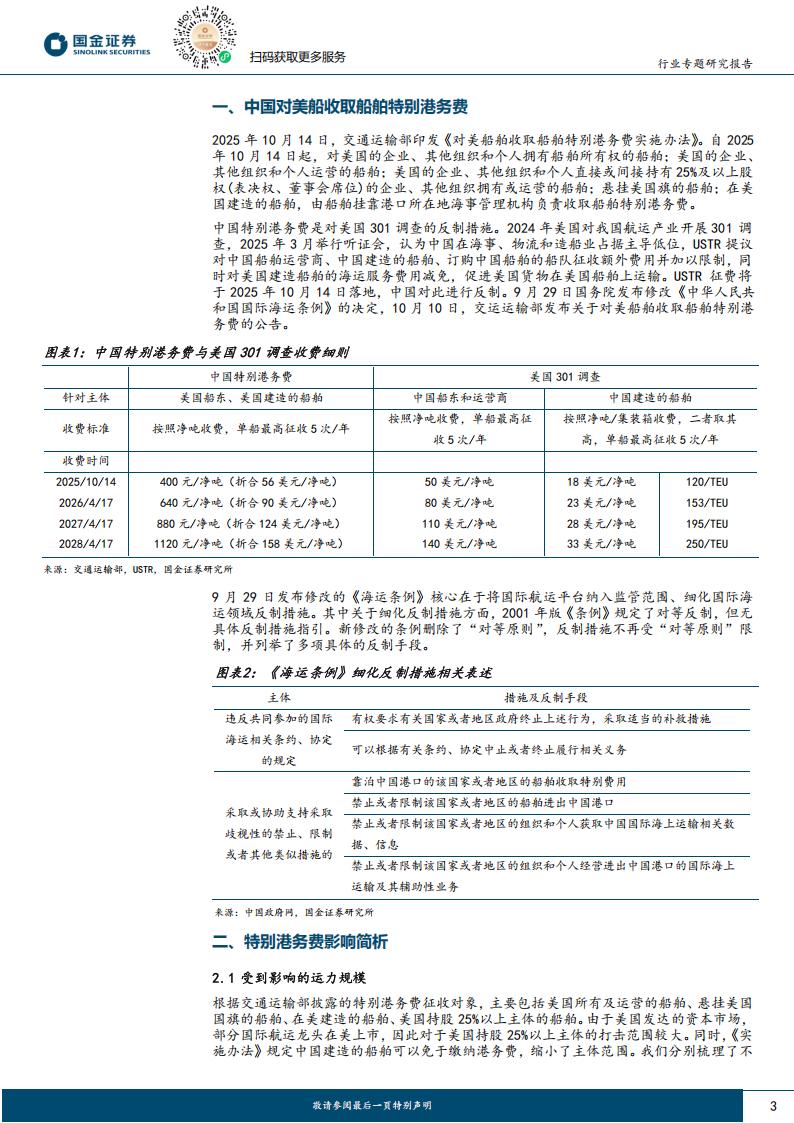 中国特别港务费是对美国301调查的反制措施。2024年美国对我国航运产业开展301调查,2025年3月举行听证会,认为中国在海事、物流和造船业占据主导低位,USTR提议对中国船舶运营商、中国建造的船舶、订购中国船舶的船队征收额外费用并加以限制,同时对美国建造船舶的海运服务费用减免,促进美国货物在美国船舶上运输。USTR征费将于2025年10月14日落地,中国对此进行反制。9月29日国务院发布修改《中华人民共和国国际海运条例》的决定,10月10日,交运运输部发布关于对美船舶收取船舶特别港务费的公告。9月29日发布修改的《海运条例》核心在于将国际航运平台纳入监管范围、细化国际海运领域反制措施。其中关于细化反制措施方面,2001年版《条例》规定了对等反制,但无具体反制措施指引。新修改的条例删除了“对等原则”,反制措施不再受“对等原则”限制,并列举了多项具体的反制手段。