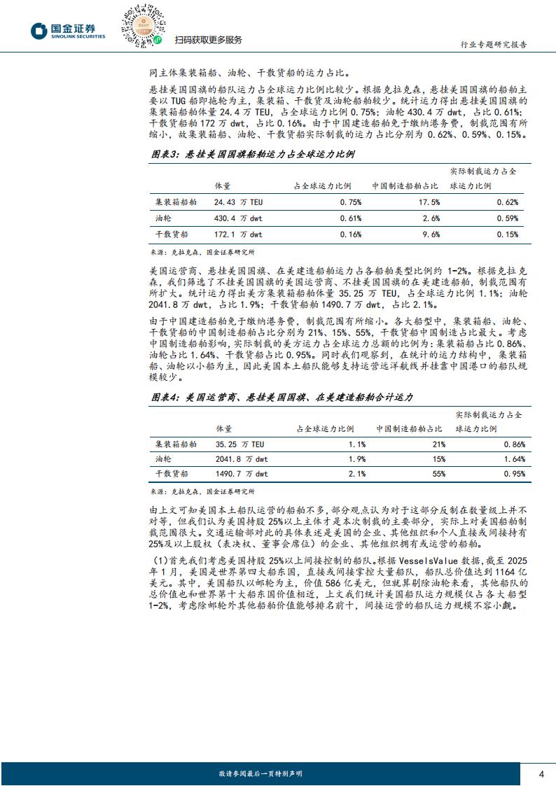 由于中国建造船舶免于缴纳港务费,制裁范围有所缩小。各大船型中,集装箱船、油轮、干散货船的中国制造船舶占比分别为21%、15%、55%,干散货船中国制造占比最大。考虑中国制造船舶影响,实际制裁的美方运力占全球运力总额的比例为:集装箱船占比0.86%、油轮占比1.64%、干散货船占比0.95%。同时我们观察到,在统计的运力结构中,集装箱船、油轮以小船为主,因此美国本土船队能够支持运营远洋航线并挂靠中国港口的船队规模较少。由上文可知美国本土船队运营的船舶不多,部分观点认为对于这部分反制在数量级上并不对等,但我们认为美国持股25%以上主体才是本次制裁的主要部分,实际上对美国船舶制裁范围很大。交通运输部对此的具体表述是美国的企业、其他组织和个人直接或间接持有25%及以上股权(表决权、董事会席位)的企业、其他组织拥有或运营的船舶。