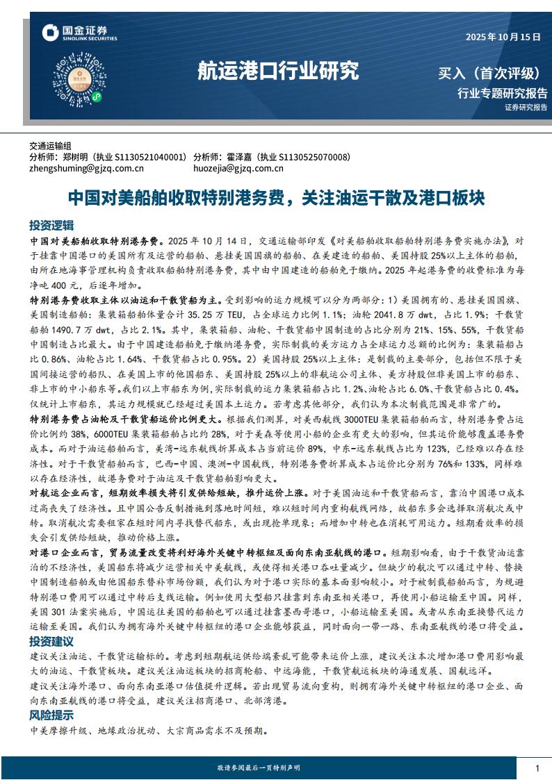 中国对美船舶收取特别港务费,关注油运干散及港口板块