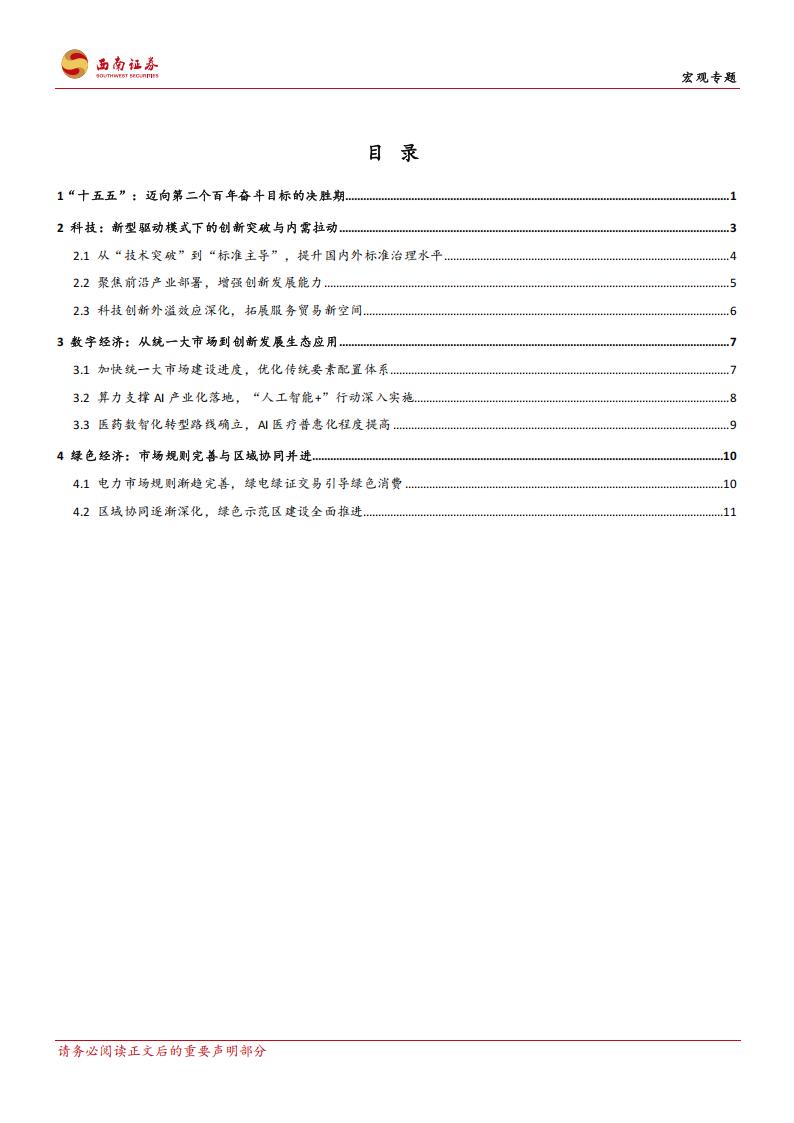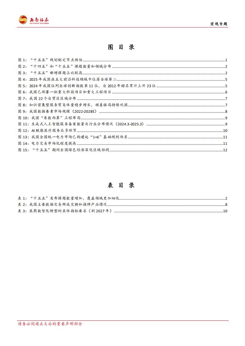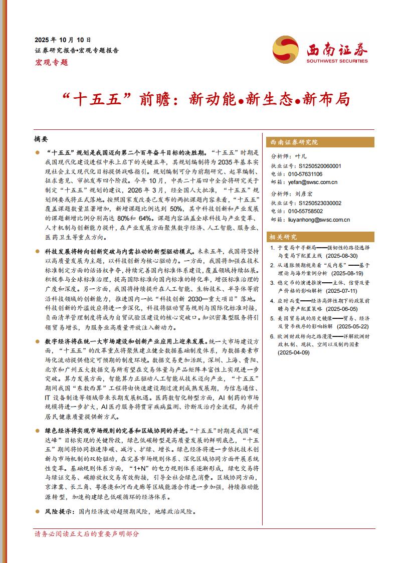自1953年起,我国就建立了编制和实施国民经济和社会发展五年规划的制度,当前,正值“十四五”规划收官和“十五五”规划衔接的关键节点。“十五五”规划作为我国迈向2035年基本实现社会主义现代化目标的重要蓝图,对于指导未来五年乃至更长时间的经济社会发展具有深远意义。我们通过对比“十四五”与“十五五”规划的研究课题,聚焦科技、数字经济和绿色经济三大重点领域,对“十五五”规划进行前瞻性分析。科技方面,在创新突破与内需拉动的发展模式推动下,我国科技标准治理水平将进一步提升,持续推进前沿产业布局与创新发展,积极融入全球化进程,推动服务贸易提质升级;数字经济方面,“十五五”期间我国将构建从统一大市场建设到“Al+医药”等具体应用的创新生态,以算力发展推进产业化落地;绿色经济方面,我国将在完善市场规则与促进区域协同方面培育新动能,稳步推进“双碳”目标实现。总体而言,“十五五”规划将更注重发展的质量、效率和可持续性,通过科技创新引领产业升级,深化数字经济与实体经济融合,推动经济社会全面绿色转型。