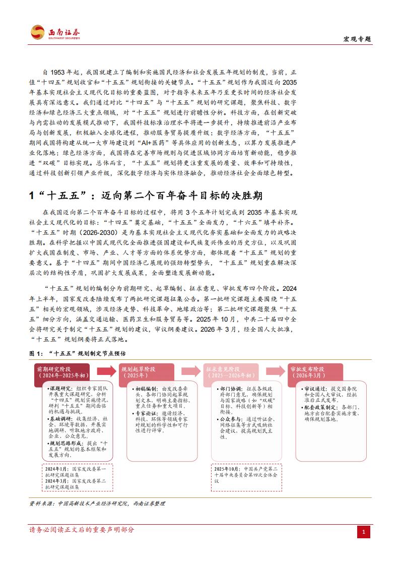 “十五五”规划的编制分为前期研究、起草编制、征求意见、审批发布四个阶段。2024年上半年,国家发改委陆续发布了两批研究课题征集公告。第一批研究课题主要围绕“十五五”相关的宏观领域,涉及经济走势、科技革命、地缘政治等;第二批研究课题聚焦“十五五”细分方向,涵盖交通运输、医药卫生和服务贸易等。2025年10月,中共二十届四中全会将研究关于制定“十五五”规划的建议,审议纲要建议。2026年3月,经全国人大批准,“十五五”规划纲要将正式落地。