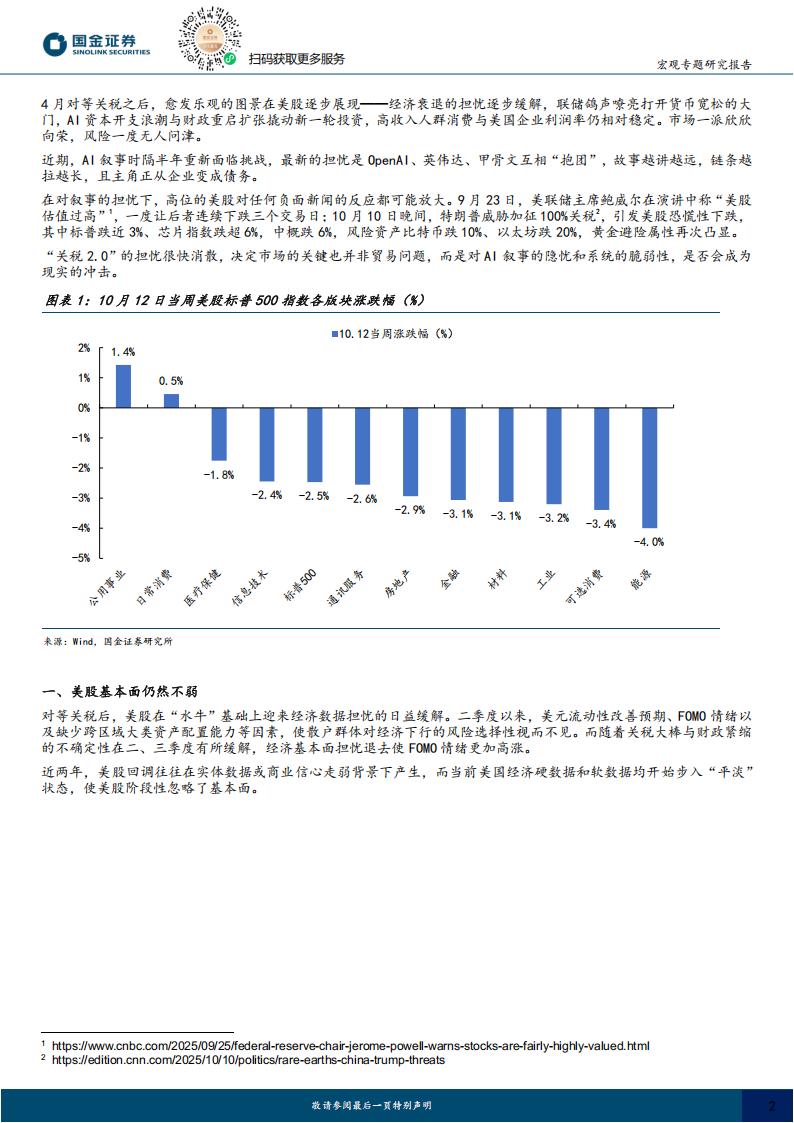 在对叙事的担忧下,高位的美股对任何负面新闻的反应都可能放大。9月23日,美联储主席鲍威尔在演讲中称“美股估值过高”,一度让后者连续下跌三个交易日;10月10日晚间,特朗普威胁加征100%关税²,引发美股恐慌性下跌,其中标普跌近3%、芯片指数跌超6%,中概跌6%,风险资产比特币跌10%、以太坊跌20%,黄金避险属性再次凸显。