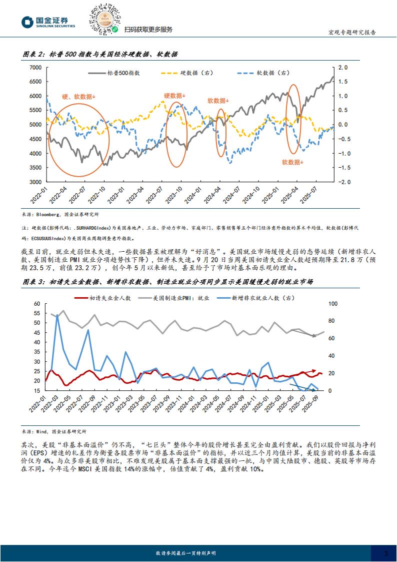 近两年,美股回调往往在实体数据或商业信心走弱背景下产生,而当前美国经济硬数据和软数据均开始步入“平淡”状态,使美股阶段性忽略了基本面。截至目前,就业走弱但未失速,一些数据甚至被理解为“好消息”。美国就业市场缓慢走弱的态势延续(新增非农人数、美国制造业PMI就业分项趋势性下降),但并未失速。9月20日当周美国初请失业金人数超预期降至21.8万(预期23.5万,前值23.2万),创今年5月以来新低,甚至给予了市场对基本面乐观的理由。