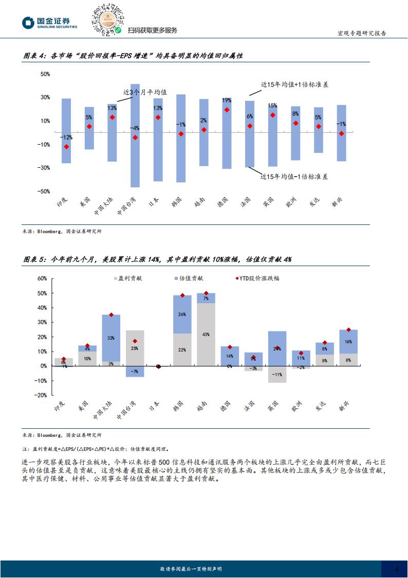 从基本面看,美股仍具备较强支撑。一方面,经济与就业韧性凸显。经济数据担忧消退推升散户FOMO情绪,就业市场缓慢走弱但未失速;美股“非基本面溢价”仅4%,标普500信息科技、通讯服务板块及“七巨头”上涨基本由盈利驱动,MSCI美国指数年内14%涨幅中盈利贡献占比达10%。另一方面,政策与资金面形成助力。投资者对财政由紧缩转为扩张持短期乐观态度,认为其将拉动私人部门需求;降息预期下,30年期抵押贷款利率降至近11个月新低,地产板块显现反弹迹象;高收入人群财富效应支撑零售企业盈利,海外资金也从1-4月的“撤离”转向7-9月的“重返”。尽管传统估值指标处历史高位,但分子端高生产力预期与企业充裕现金流仍对美股形成支撑,且美股长期交易拥挤度较低,短期回调或继续吸引资金入场。