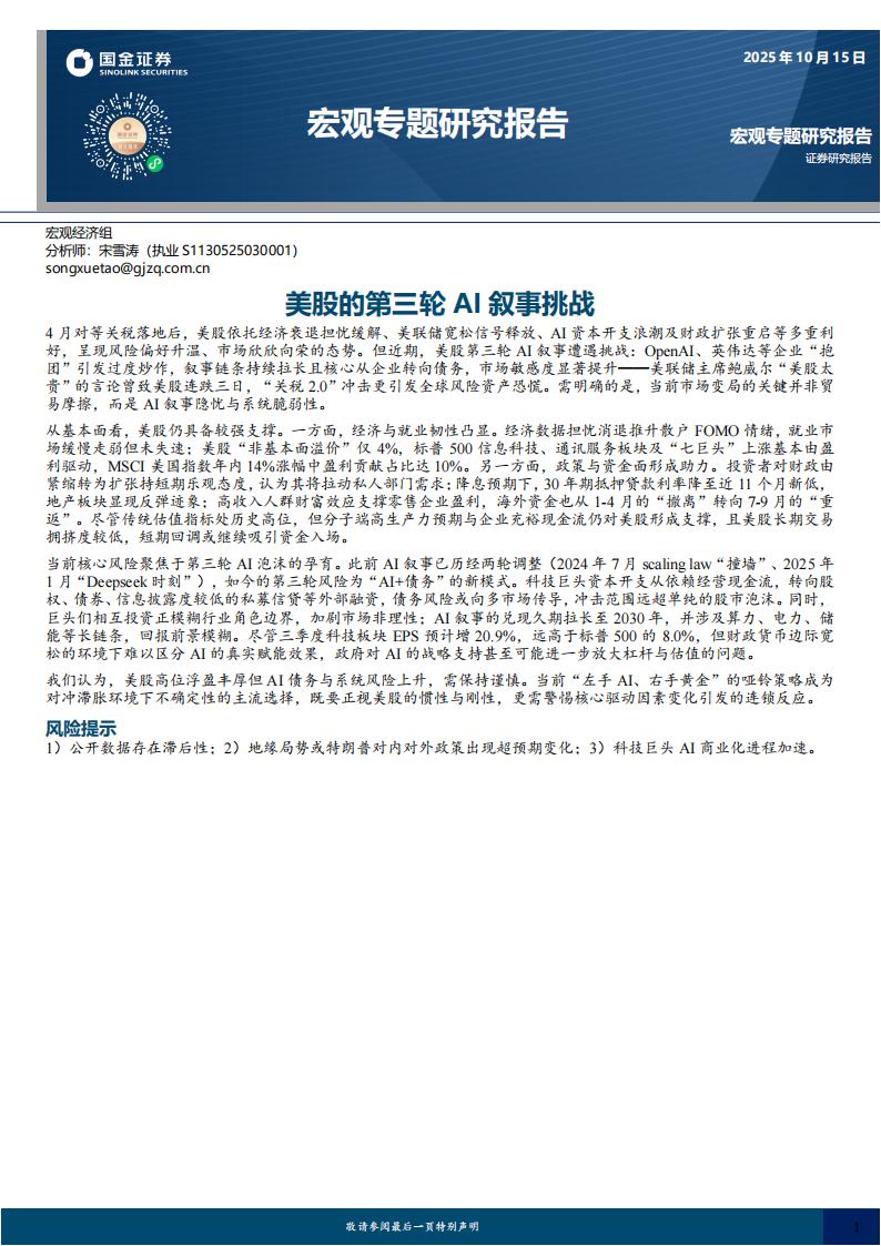 当前核心风险聚焦于第三轮AI泡沫的孕育。此前AI叙事已历经两轮调整(2024年7月scaling law“撞墙”、2025年1月“Deepseek时刻”),如今的第三轮风险为“AI+债务”的新模式。科技巨头资本开支从依赖经营现金流,转向股权、债券、信息披露度较低的私募信贷等外部融资,债务风险或向多市场传导,冲击范围远超单纯的股市泡沫。同时,巨头们相互投资正模糊行业角色边界,加剧市场非理性;AI叙事的兑现久期拉长至2030年,并涉及算力、电力、储能等长链条,回报前景模糊。尽管三季度科技板块EPS预计增20.9%,远高于标普500的8.0%,但财政货币边际宽松的环境下难以区分AI的真实赋能效果,政府对AI的战略支持甚至可能进一步放大杠杆与估值的问题。