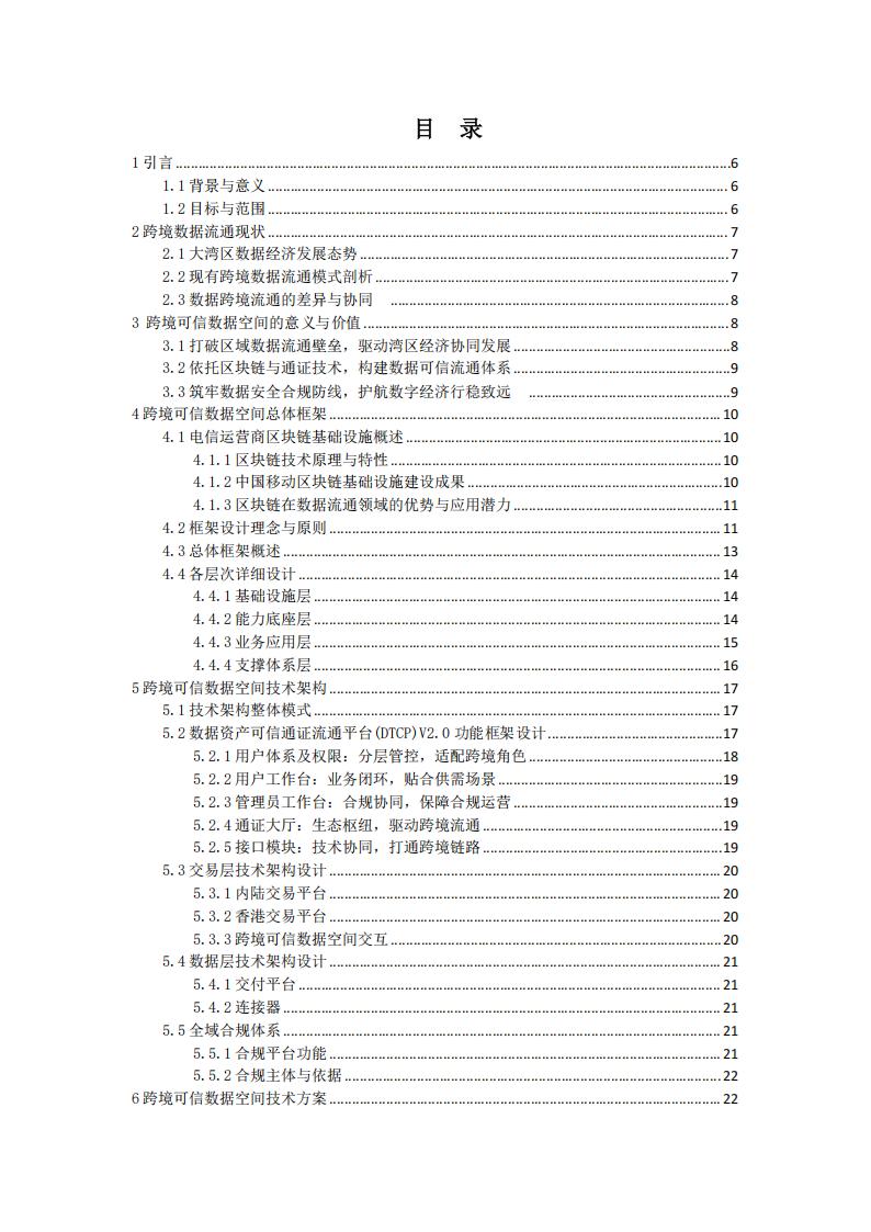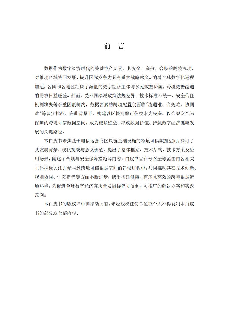 本白皮书旨在系统阐释基于电信运营商区块链基础设施构建粤港澳跨境可信数据空间的完整技术路径,包括底层架构设计、核心技术实现、应用场景落地及未来发展方向。通过梳理电信运营商在区块链、隐私计算等领域的技术积累,结合粤港澳跨境数据流通的实际需求,展现如何依托中移链等基础设施打造“合规可控、可信高效”的数据跨境流通环境,并通过具体应用案例说明技术方案的可行性与实践价值。