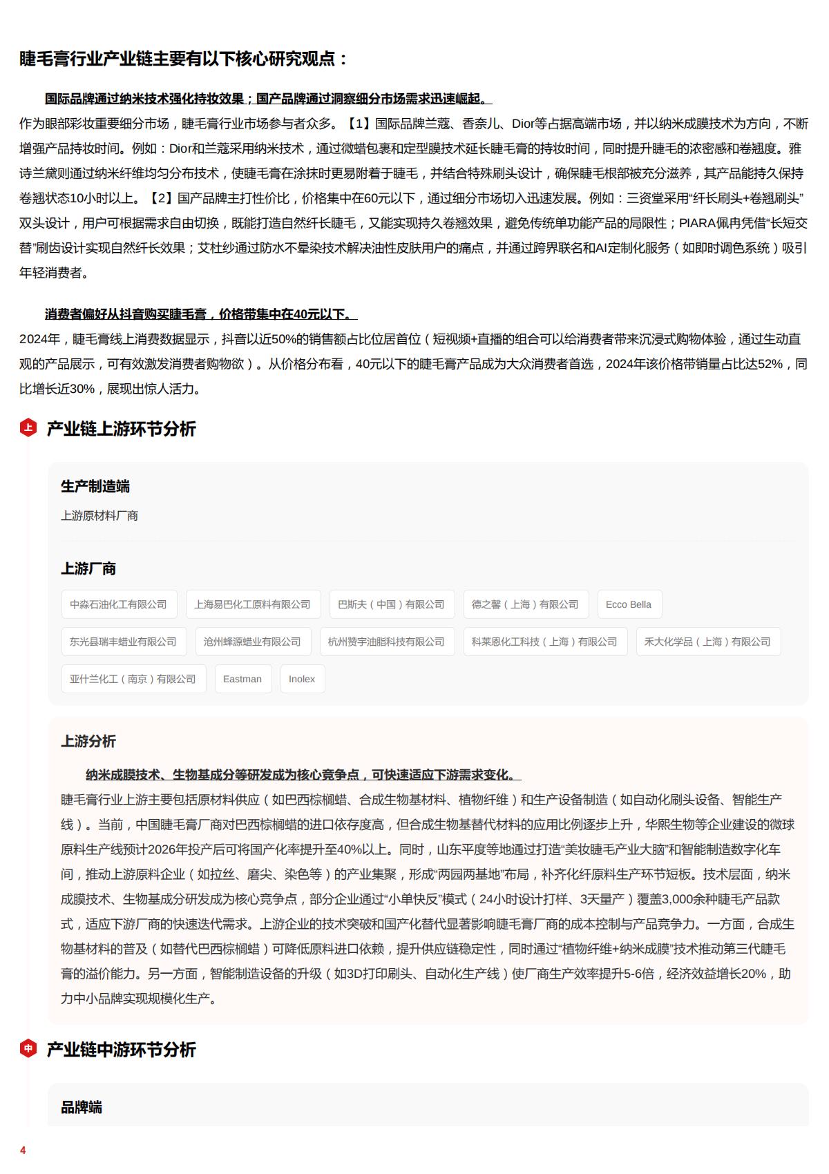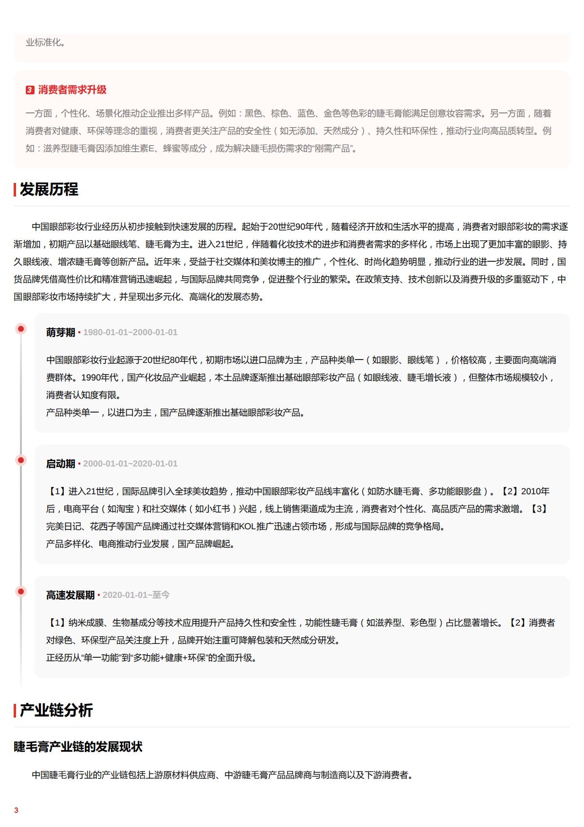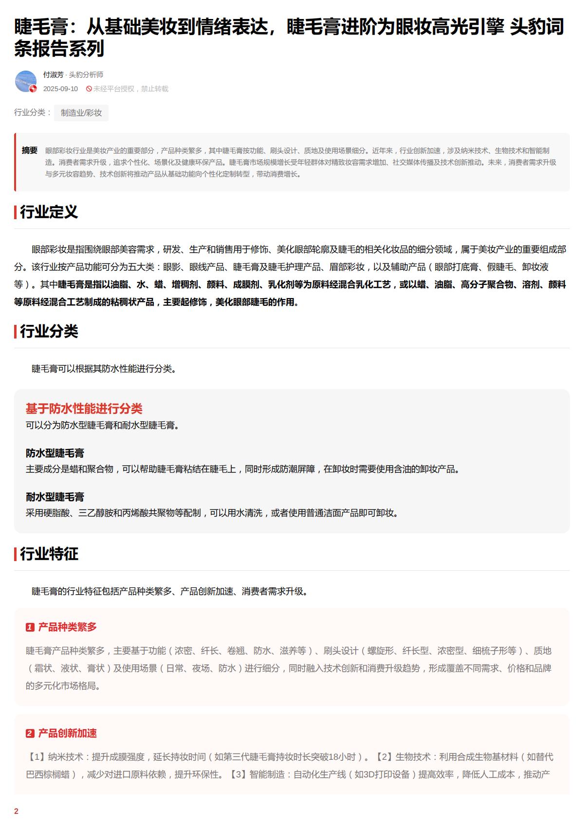 摘要限彩救行业是美妆产业的重要部分,产品种类繁多,其中徒毛膏技功能、刷头设计、原地及使用场原细分,近年来,行业创断加速,涉及结米技术、生物技术和智能划造,消费者需求升级,追求个性化、场里化及健康环保产品。陆毛膏市场规模增长受年轻群体对精致救容需求增加、社交媒体传播及技术色新旌动,未来,消甚者需求升级与多元妆容想势、技术创新将益动产品从基础功能向个性化定制型,带动消费增长。