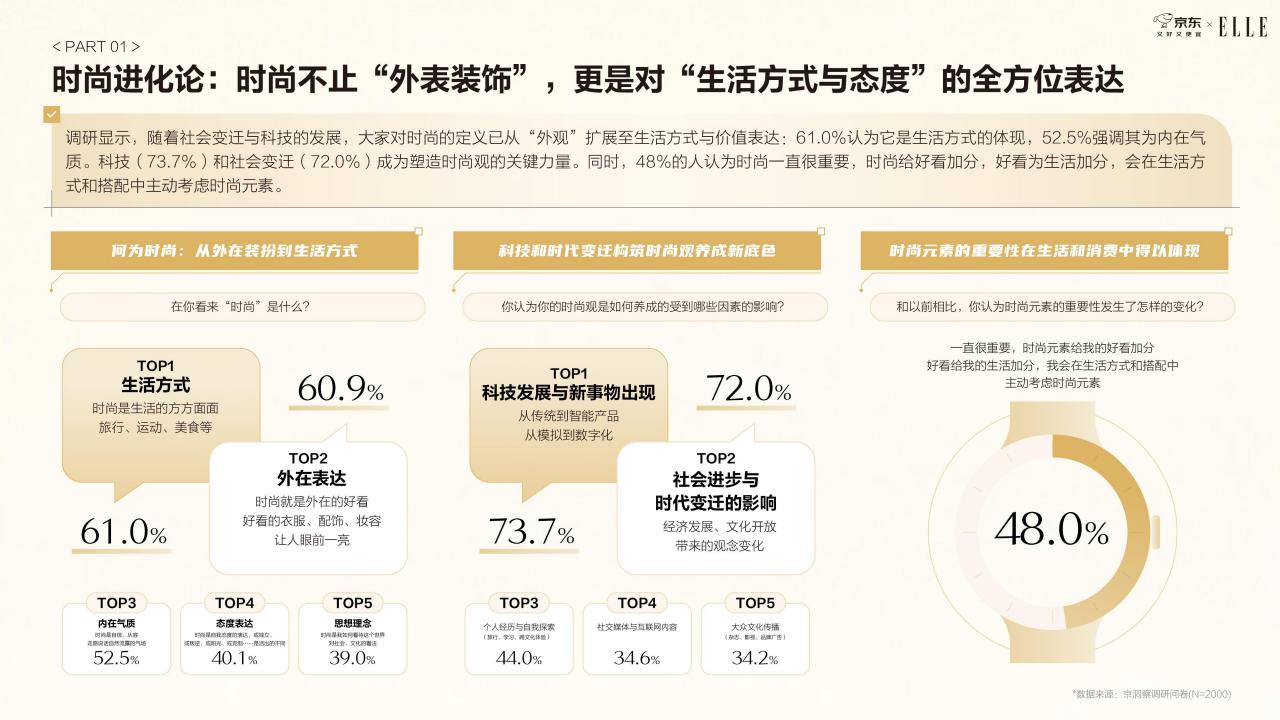 调研显示,随着社会变迁与科技的发展,大家对时尚的定义已从“外观”扩展至生活方式与价值表达:61.0%认为它是生活方式的体现,52.5%强调其为内在气质。科技(73.7%)和社会变迁(72.0%)成为塑造时尚观的关键力量。同时,48%的人认为时尚一直很重要,时尚给好看加分,好看为生活加分,会在生活方式和搭配中主动考虑时尚元素。