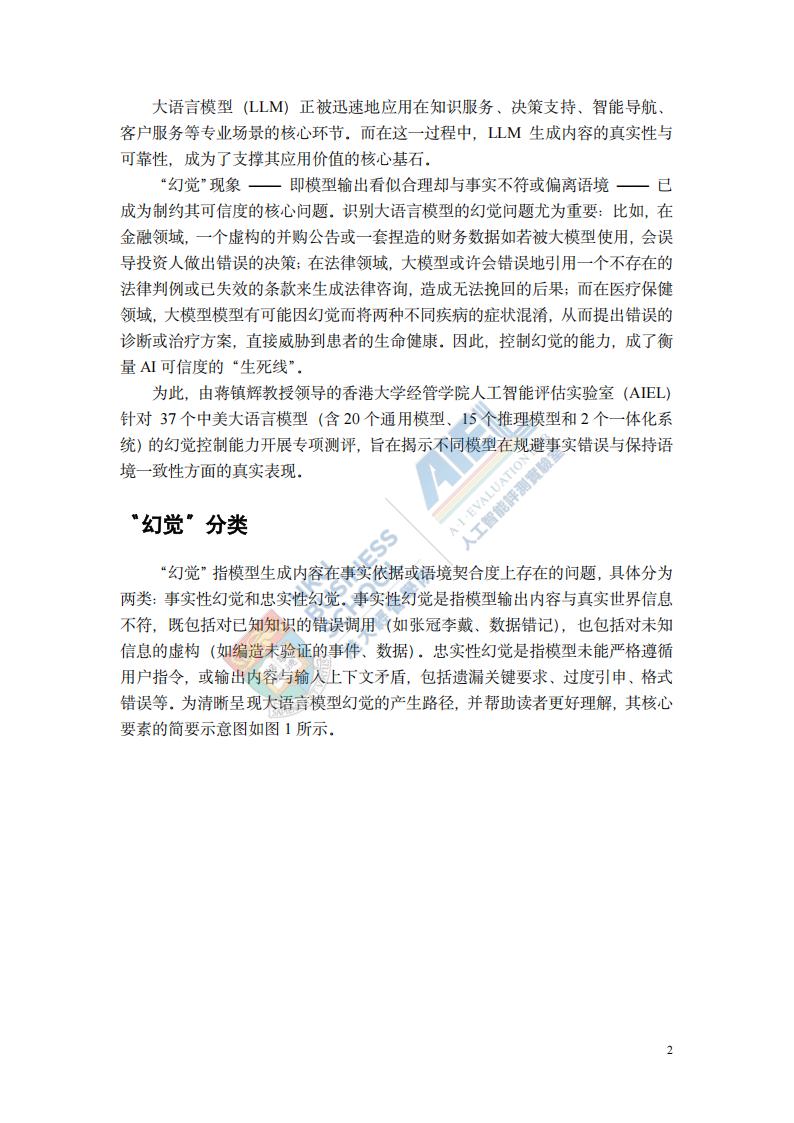为此,由蒋镇辉教授领导的香港大学经管学院人工智能评估实验室(AIEL)针对37个中美大语言模型(含20个通用模型、15个推理模型和2个一体化系统)的幻觉控制能力开展专项测评,旨在揭示不同模型在规避事实错误与保持语境一致性方面的真实表现。