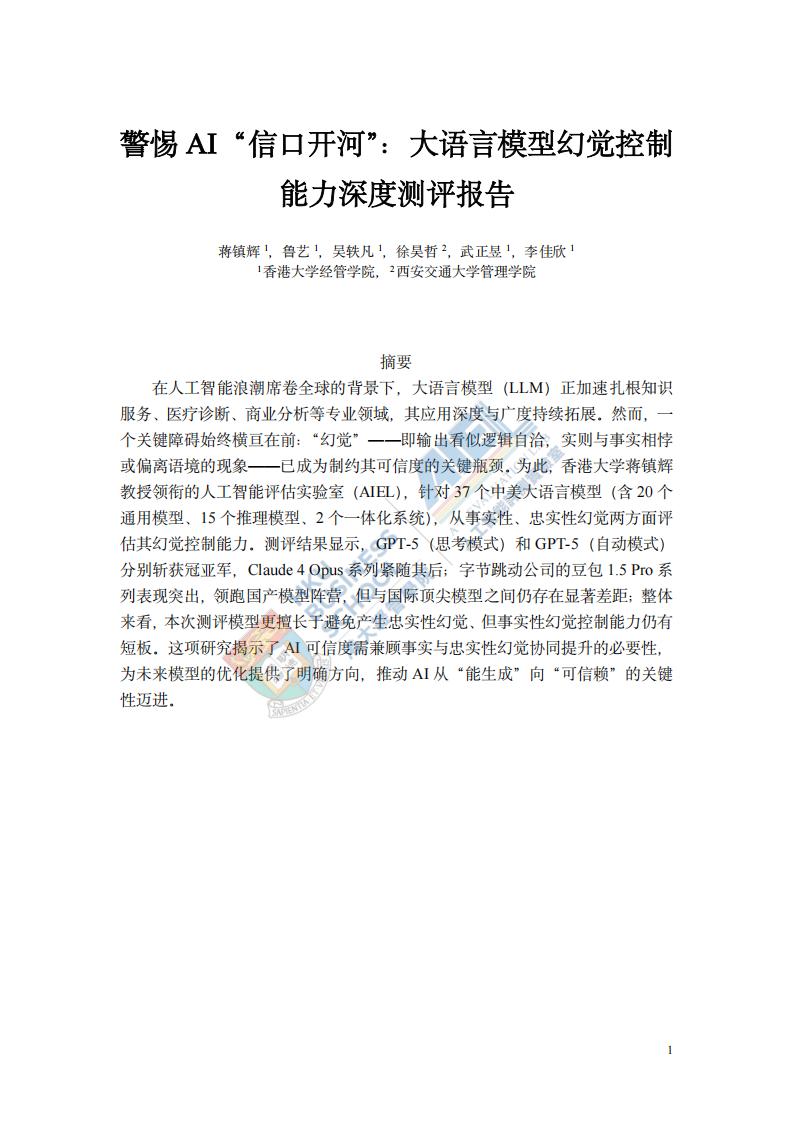 在人工智能浪潮席卷全球的背景下,大语言模型(LLM)正加速扎根知识服务、医疗诊断、商业分析等专业领域,其应用深度与广度持续拓展。然而,一个关键障碍始终横亘在前:“幻觉”——即输出看似逻辑自洽,实则与事实相悖或偏离语境的现象——已成为制约其可信度的关键瓶颈。为此,香港大学蒋镇辉教授领衔的人工智能评估实验室(AIEL),针对37个中美大语言模型(含20个通用模型、15个推理模型、2个一体化系统),从事实性、忠实性幻觉两方面评估其幻觉控制能力。测评结果显示,GPT-5(思考模式)和GPT-5(自动模式)分别斩获冠亚军,Claude 4 Opus系列紧随其后;字节跳动公司的豆包1.5 Pro系列表现突出,领跑国产模型阵营,但与国际顶尖模型之间仍存在显著差距;整体来看,本次测评模型更擅长于避免产生忠实性幻觉、但事实性幻觉控制能力仍有短板。这项研究揭示了AI可信度需兼顾事实与忠实性幻觉协同提升的必要性,为未来模型的优化提供了明确方向,推动AI从“能生成”向“可信赖”的关键