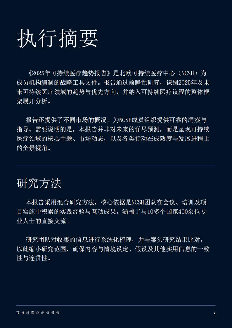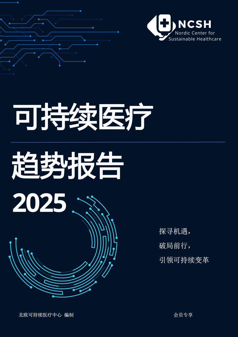 《2025年可持续医疗趋势报告》是北欧可持续医疗中心(NCSH)为成员机构编制的战略工具文件。报告通过前瞻性研究,识别2025年及未来可持续医疗领域的趋势与优先方向,并纳入可持续医疗议程的整体框架展开分析。