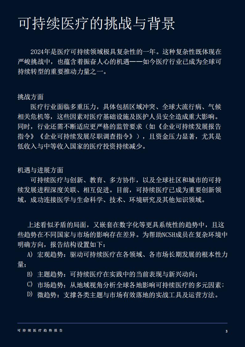 报告还提供了不同市场的概况,为NCSH成员组织提供可靠的洞察与指导。需要说明的是,本报告并非对未来的详尽预测,而是呈现可持续医疗领域的核心主题、市场动态,以及各类行动在成熟度与发展进程上的全景视角。