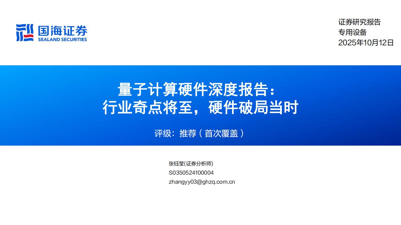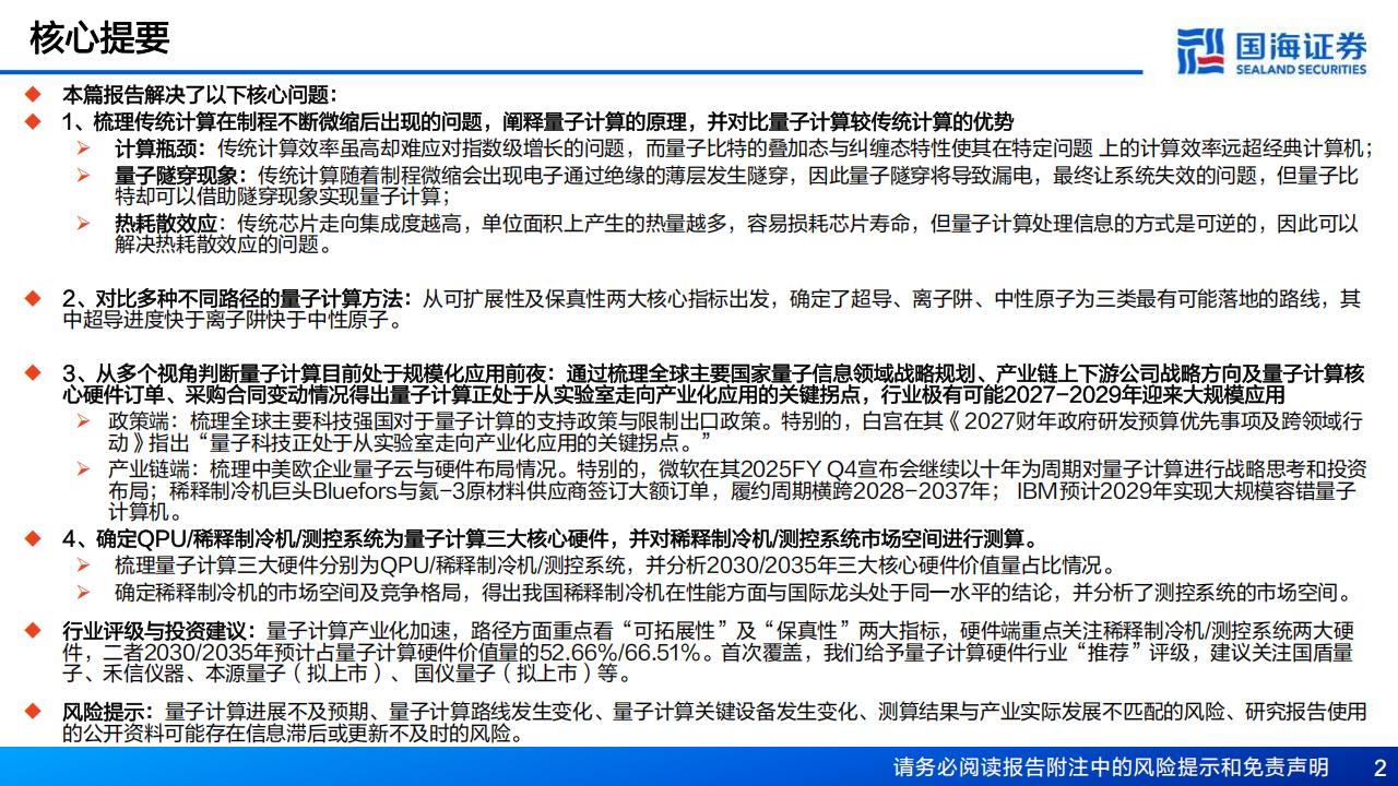 件,二者2030/2035年预计占量子计算硬件价值量的52.66%/66.51%。首次覆盖,我们给予量子计算硬件行业“推荐”评级,建议关注国盾量子、禾信仪器、本源量子(拟上市)、国仪量子(拟上市)等。