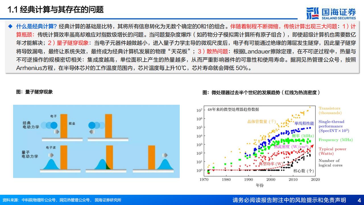 什么是经典计算?经典计算的基础是比特,其将所有信息转化为无数个确定的O和1的组合。伴随着制程不断微缩,传统计算出现三大问题:1)计算瓶颈:传统计算效率虽高却难应对指数级增长的问题。当问题复杂度爆炸(如药物分子模拟需计算所有原子组合),即使超级计算机也需要数亿年才能解决;2)量子隧穿现象:当电子元器件越做越小,进入量子力学主导的微观尺度后,电子有可能通过绝缘的薄层发生隧穿,因此量子隧穿将导致漏电,最终让系统失效,最终成为经典计算机发展的物理“天花板”;3)散热问题:根据Landauer擦除定理,在不可逆过程中,热量与不可逆操作的规模密切相关:集成度越高,单位面积上产生的热量越多,从而严重影响器件的可靠性和使用寿命。据洞见热管理公众号,按照Arrhenius方程,在半导体芯片的工作温度范围内,芯片温度每上升10℃,芯片寿命就会降低50%。