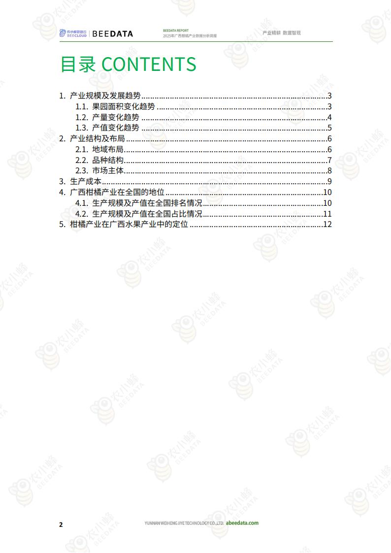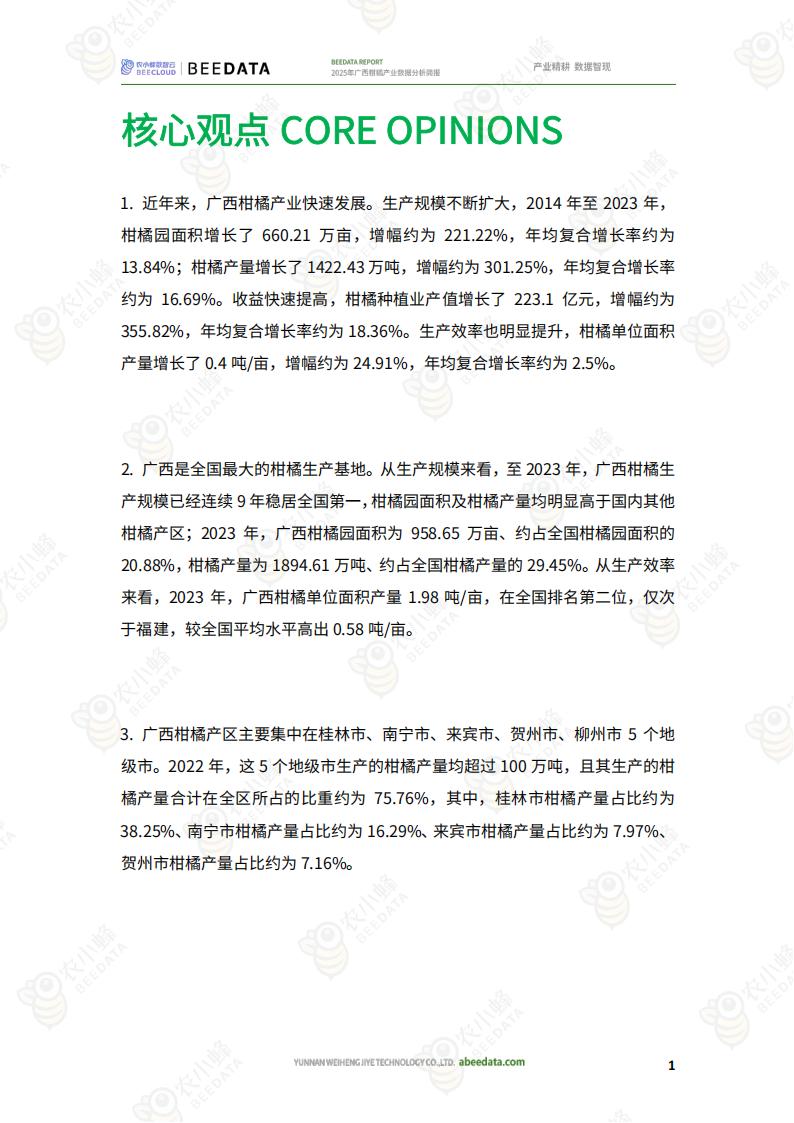 本文基于农小蜂在运营过程中积累的中国及广西壮族自治区柑橘种植面积、产量、需求量、消费量、品牌等数据,从柑橘生产、流通及销售过程中关联的市场、农特品牌、企业等角度为从事柑橘科研、育种、种植、加工、仓储、包装、保鲜、运输、销售等活动的主体及社会化服务机构提供参考。