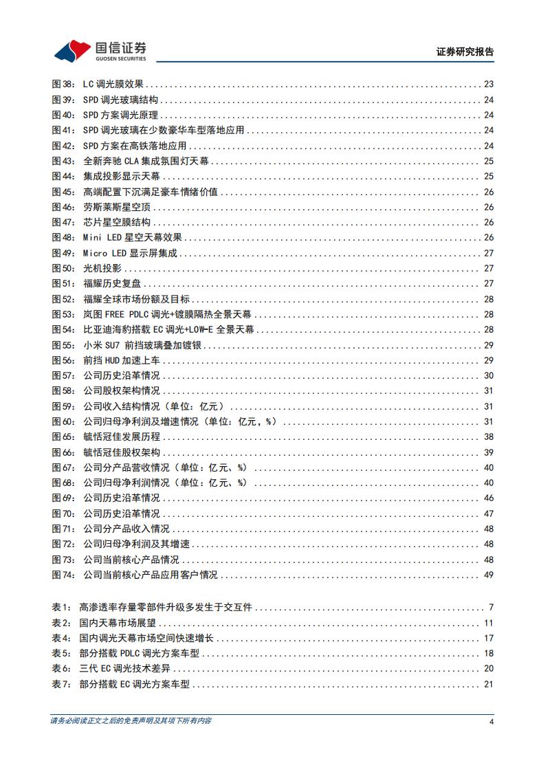 显示级天幕带动交互应用,尚未进入规模量产,但远期发展潜力巨大。汽车智能化大背景下,作为人车交互载体的车内屏幕面积持续扩大,而汽车玻璃占据车身表面积约三分之一,材质与光、电、影像结合友好,有望承接中控仪表等成为下一个交互媒介(比如HUD应用就将仪表显示转移至前档玻璃),福耀创新提出透明mini-LED氛围灯玻璃、Micro LED等显示屏集成或投影打造显示玻璃等个性化应用,天幕产品持续进化。