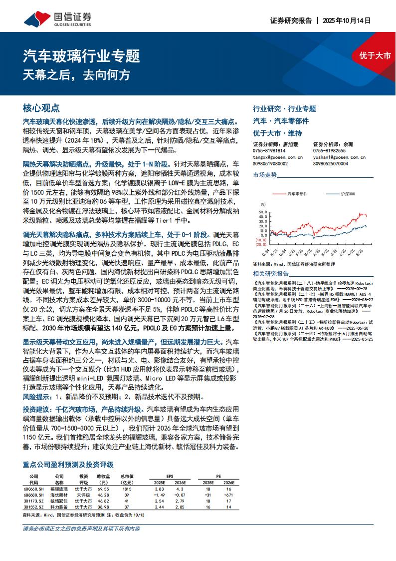 汽车玻璃天幕化快速渗透,后续升级方向在解决隔热/隐私/交互三大痛点。相较传统天窗和钢车顶,天幕玻璃在美学/空间各方面表现占优,近年来渗透率快速提升(2024年18%),天幕普及之后,针对防晒/隐私/交互等痛点,隔热、调光、显示级天幕有望依次发展为下一代爆品。