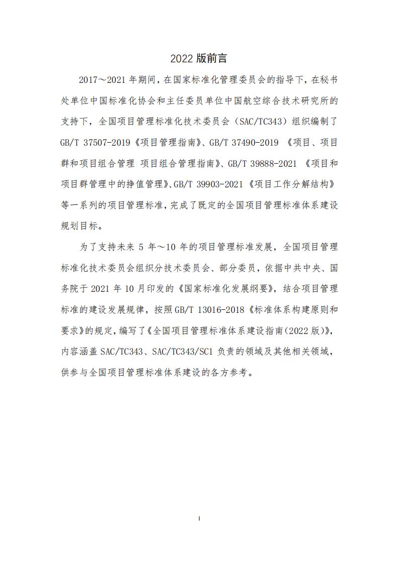 为了支持未来5年~10年的项目管理标准发展,全国项目管理标准化技术委员会组织分技术委员会、部分委员,依据中共中央、国务院于2021年10月印发的《国家标准化发展纲要》,结合项目管理标准的建设发展规律,按照GB/T 13016-2018《标准体系构建原则和要求》的规定,编写了《全国项目管理标准体系建设指南(2022版)》,内容涵盖SAC/TC343、SAC/TC343/SC1负责的领域及其他相关领域,供参与全国项目管理标准体系建设的各方参考。