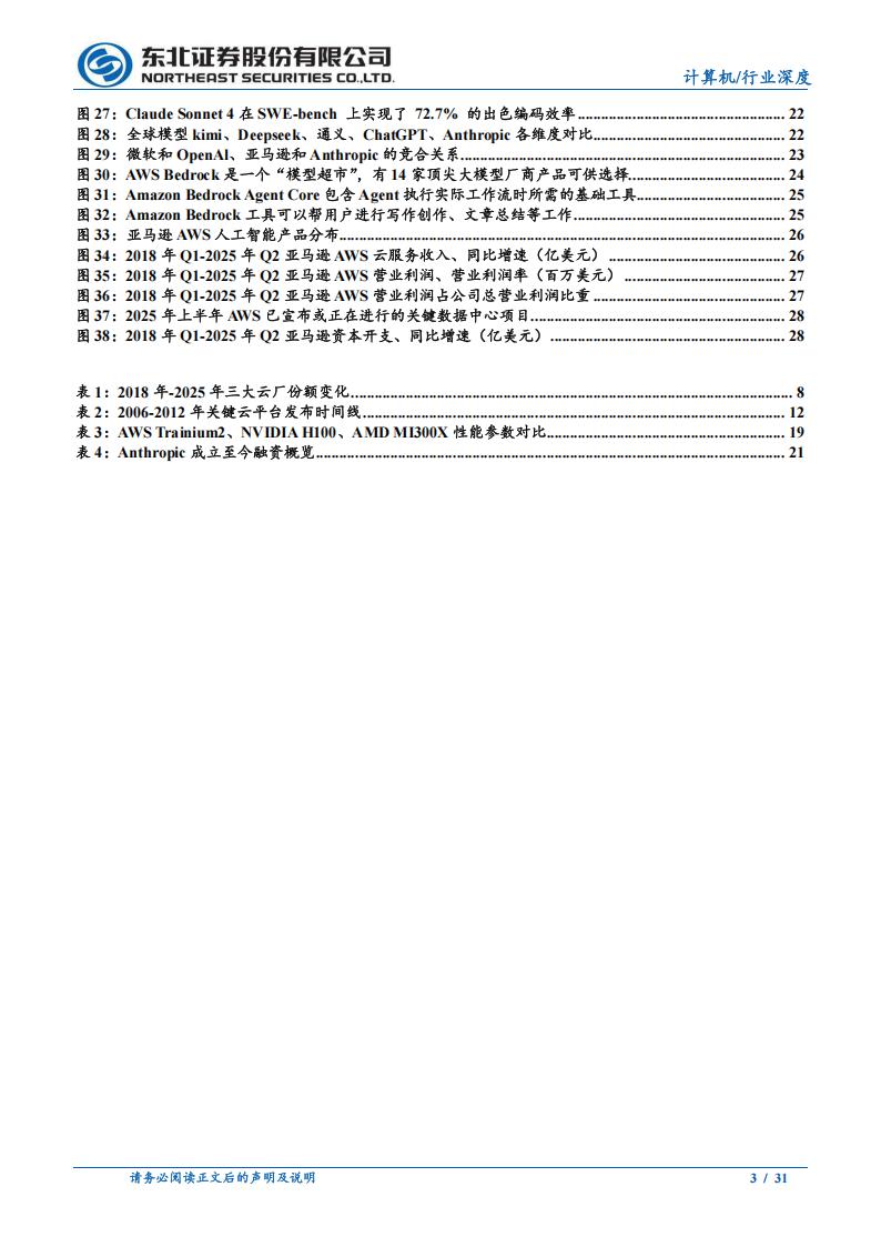 市场集中度或将进一步提升,三大巨头卡位“云+AI”生态,竞争升维。亚马逊AWS、微软Azure和谷歌云合计占据全球超三分之二的市场份额,且领先优势在AI时代有望进一步扩大。巨头们纷纷与顶级AI模型公司深度绑定,竞争焦点从单一的基础设施服务(laaS)转向以模型质量、集成度和安全性为核心的AI平台即服务、综合实力的对抗。