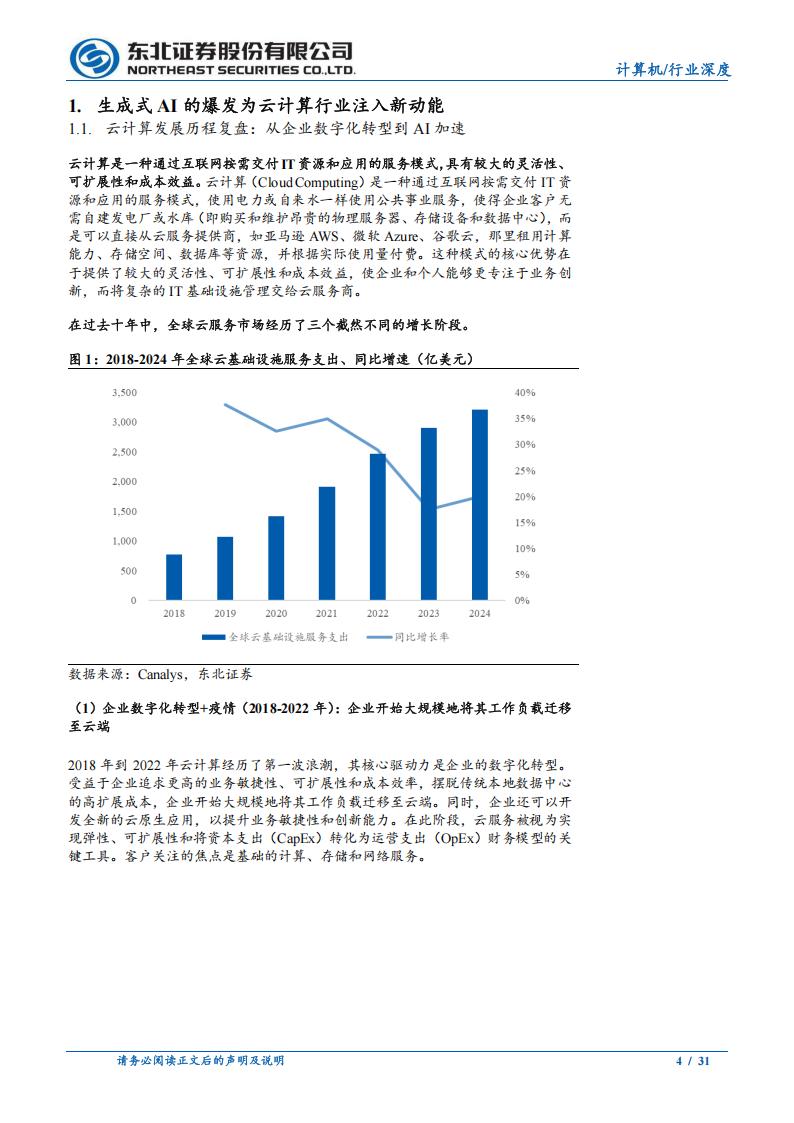云计算是一种通过互联网按需交付IT资源和应用的服务模式,具有较大的灵活性、可扩展性和成本效益。云计算(Cloud Computing)是一种通过互联网按需交付IT资源和应用的服务模式,使用电力或自来水一样使用公共事业服务,使得企业客户无需自建发电厂或水库(即购买和维护昂贵的物理服务器、存储设备和数据中心),而是可以直接从云服务提供商,如亚马逊AWS、微软Azure、谷歌云,那里租用计算能力、存储空间、数据库等资源,并根据实际使用量付费。这种模式的核心优势在于提供了较大的灵活性、可扩展性和成本效益,使企业和个人能够更专注于业务创新,而将复杂的IT基础设施管理交给云服务商。2018年到2022年云计算经历了第一波浪潮,其核心驱动力是企业的数字化转型。受益于企业追求更高的业务敏捷性、可扩展性和成本效率,摆脱传统本地数据中心的高扩展成本,企业开始大规模地将其工作负载迁移至云端。同时,企业还可以开发全新的云原生应用,以提升业务敏捷性和创新能力。在此阶段,云服务被视为实现弹性、可扩展性和将资本支出(CapEx)转化为运营支出(OpEx)财务模型的关键工具。客户关注的焦点是基础的计算、存储和网络服务。