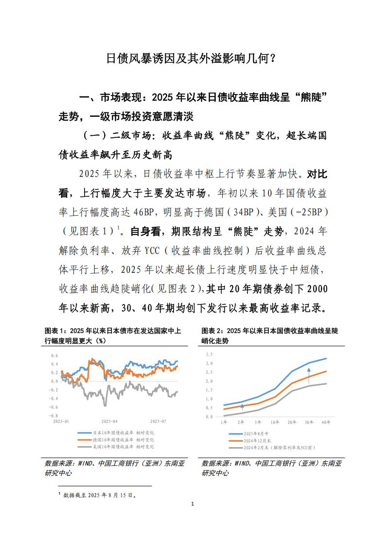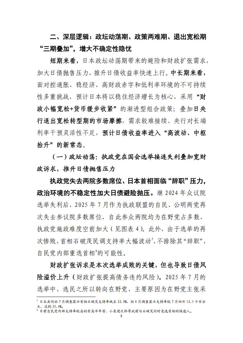 2025年以来日本国债收益率显著上行,收益率曲线“熊陡”变化,超长端国债收益率飙升至历史新高;一级市场认购倍数下滑,需求持续疲软,财务省干预政策效果有限。其深层原因包括:(1)日本政坛动荡期带来的避险和财政扩张需求,加大日债抛售压力,推升日债收益率快速上行;(2)日本财政面临宽松的必要性与财政可持续性担忧之间的“两难”困境,货币政策也面临控通胀的必要性与抑制经济增长的担忧之间的“两难”困境,预计日本将以稳住经济增长为核心,采用“财政小幅宽松+货币缓步收紧”的渐进型组合政策;(3)日央行退出宽松转型期的市场摩擦,需求较难接续、央行对长端利率干预灵活性不足,预计日债收益率进入“高波动、中枢抬升”的新常态。