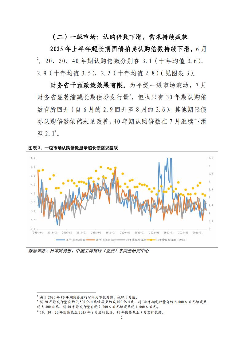 财务省干预政策效果有限。为平缓一级市场波动,7月财务省显著缩减长期债券发行量³,但也只有30年期认购倍数有所回升(自6月的2.9回升至8月的3.6),其他期限债券认购倍数依然未见改善,40年期认购倍数在7月继续下滑至2.1⁴。