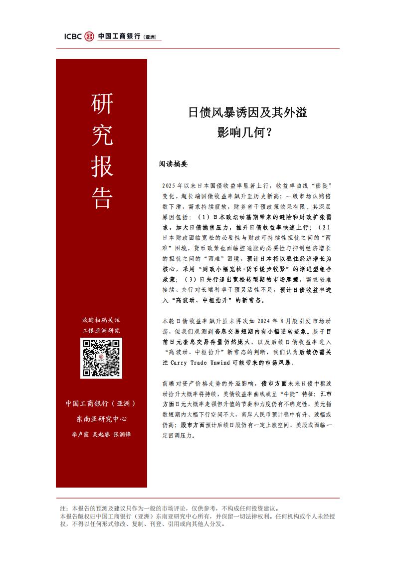 短期来看,日本政坛动荡期带来的避险和财政扩张需求,加大日债抛售压力,推升日债收益率快速上行。中长期来看,面对控通胀、稳经济、高财政赤字和低利率环境的不可持续性多重挑战,预计日本将以稳住经济增长为核心,采用“财政小幅宽松+货币缓步收紧”的渐进型组合政策;叠加日央行退出宽松转型期的市场摩擦,需求较难接续、央行对长端利率干预灵活性不足,预计日债收益率进入“高波动、中枢抬升”的新常态。