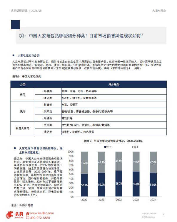 近几年,中国大家电市场受到宏观经济影响、政策引导及消费升级多重驱动,渠道格局深度变革。2021-2022年线下消费受阻,线上凭借便捷性快速渗透,占比持续攀升;2023-2024年,线下经济复苏调整,叠加2024年以旧换新政策全面落地,因补贴衔接服务、体验场景优势,迎来增长,2024年线下销售增长至47%。此外,大家电的高端化、绿色化趋势凸显,空调、高端冰洗借政策与需求增长强劲,传统洗衣机、彩电受存量饱和制约增长乏力。
