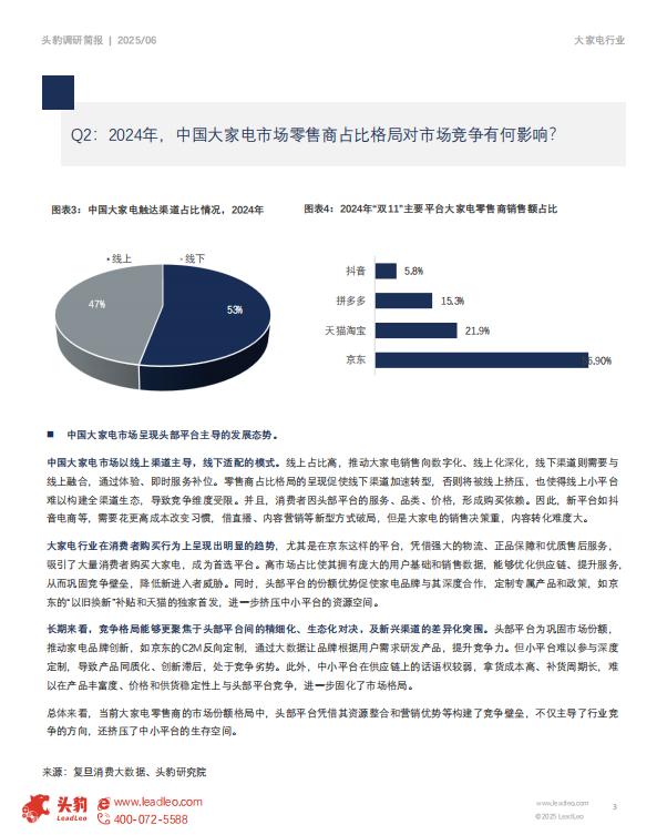 中国大家电市场以线上渠道主导,线下适配的模式。线上占比高,推动大家电销售向数字化、线上化深化,线下渠道则需要与线上融合,通过体验、即时服务补位。零售商占比格局的呈现促使线下渠道加速转型,否则将被线上挤压,也使得线上小平台难以构建全渠道生态,导致竞争维度受限。并且,消费者因头部平台的服务、品类、价格,形成购买依赖。因此,新平台如抖音电商等,需要花更高成本改变习惯,借直播、内容营销等新型方式破局,但是大家电的销售决策重,内容转化难度大。
