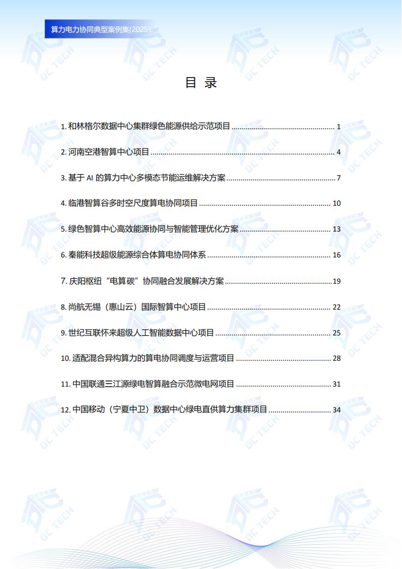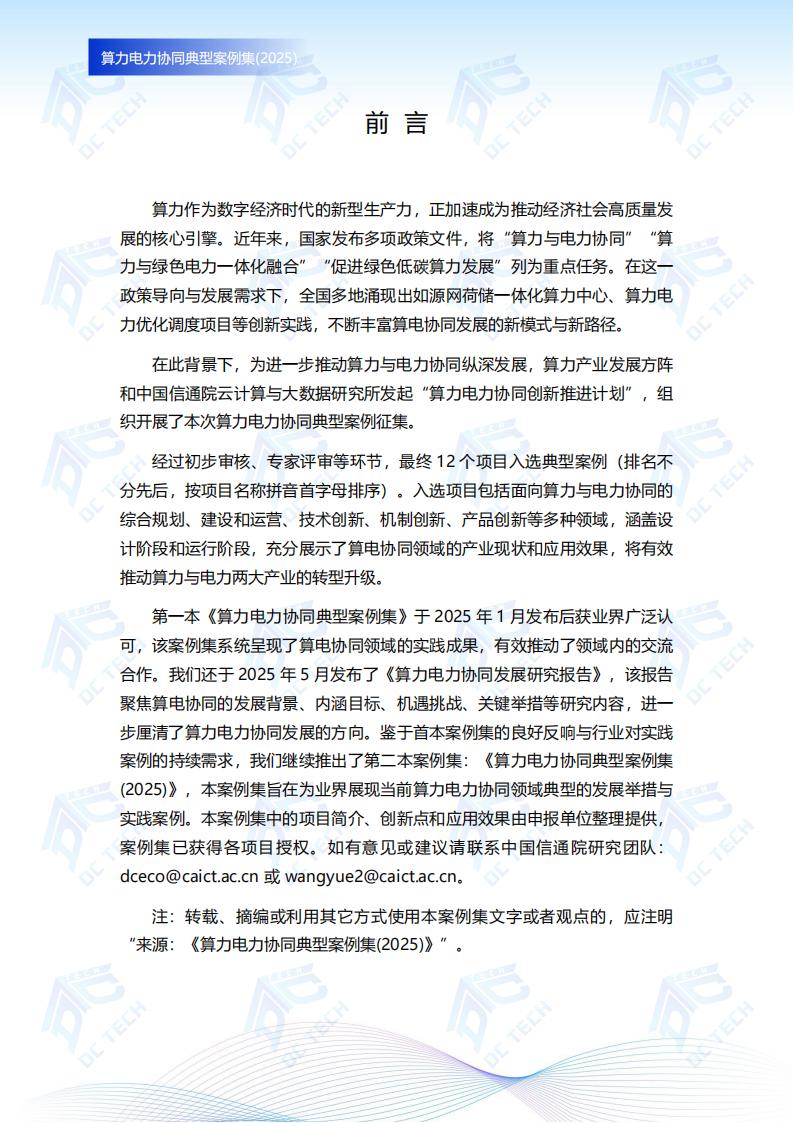 可,该案例集系统呈现了算电协同领域的实践成果,有效推动了领域内的交流合作。我们还于2025年5月发布了《算力电力协同发展研究报告》,该报告聚焦算电协同的发展背景、内涵目标、机遇挑战、关键举措等研究内容,进一步厘清了算力电力协同发展的方向。鉴于首本案例集的良好反响与行业对实践案例的持续需求,我们继续推出了第二本案例集:《算力电力协同典型案例集(2025)》,本案例集旨在为业界展现当前算力电力协同领域典型的发展举措与实践案例。本案例集中的项目简介、创新点和应用效果由申报单位整理提供,案例集已获得各项目授权。如有意见或建议请联系中国信通院研究团队:dceco@caict.ac.cn或wangyue2@caict.ac.cn。