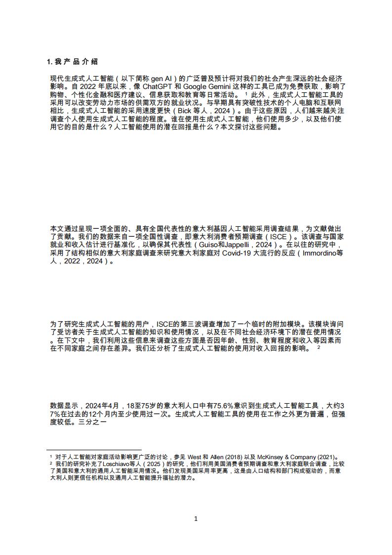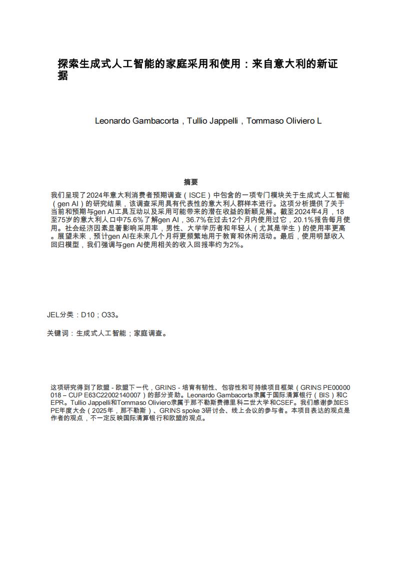 我们呈现了2024年意大利消费者预期调查(ISCE)中包含的一项专门模块关于生成式人工智能(gen AI)的研究结果,该调查采用具有代表性的意大利人群样本进行。这项分析提供了关于当前和预期与gen AI工具互动以及采用可能带来的潜在收益的新颖见解。截至2024年4月,18至75岁的意大利人口中75.6%了解gen Al,36.7%在过去12个月内使用过它,20.1%报告每月使用。社会经济因素显著影响采用率,男性、大学学历者和年轻人(尤其是学生)的使用率更高。展望未来,预计gen Al在未来几个月将更频繁地用于教育和休闲活动。最后,使用明瑟收入回归模型,我们强调与gen AI使用相关的收入回报率约为2%。这项研究得到了欧盟-欧盟下一代,GRINS-培育有韧性、包容性和可持续项目框架(GRINS PE00000018-CUP E63C22002140007)的部分资助。Leonardo Gambacorta隶属于国际清算银行(BIS)和CEPR。Tullio Jappelli和Tommaso Oliviero隶属于那不勒斯费德里科二世大学和CSEF。我们感谢参加ESPE年度大会(2025年,那不勒斯)、GRINS spoke 3研讨会、线上会议的参与者。本项目表达的观点是作者的观点,不一定反映国际清算银行和欧盟的观点。