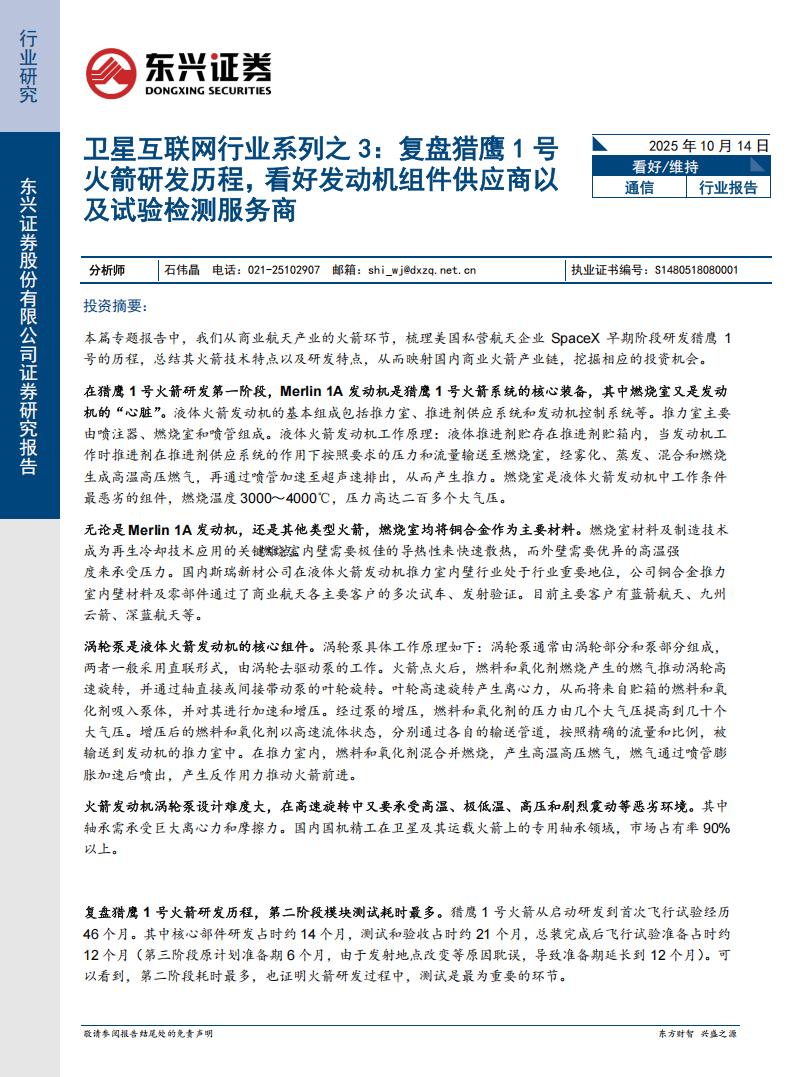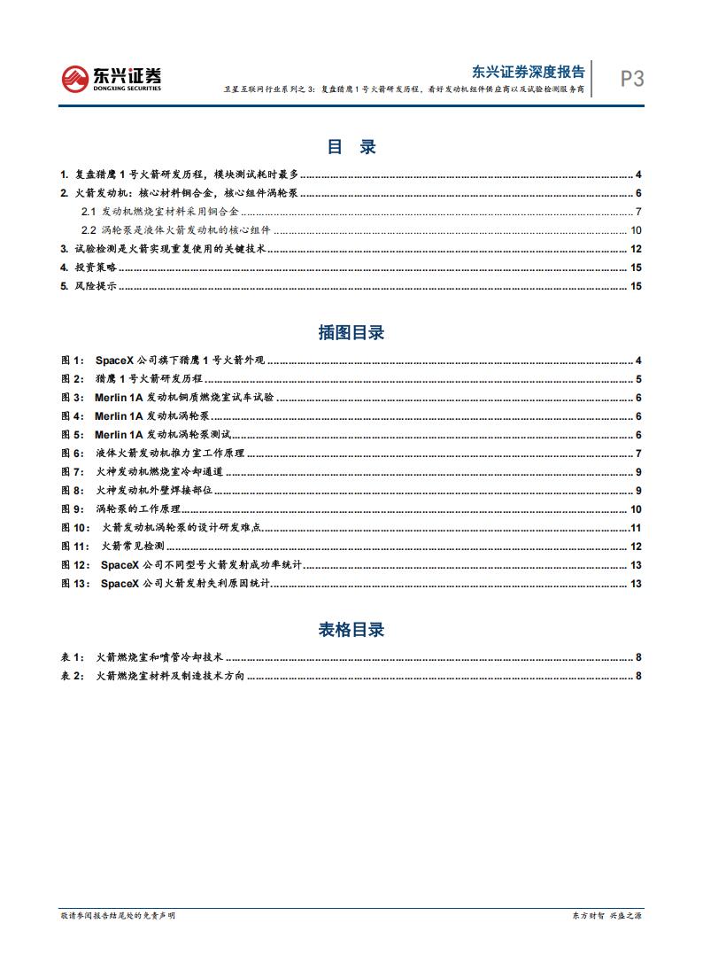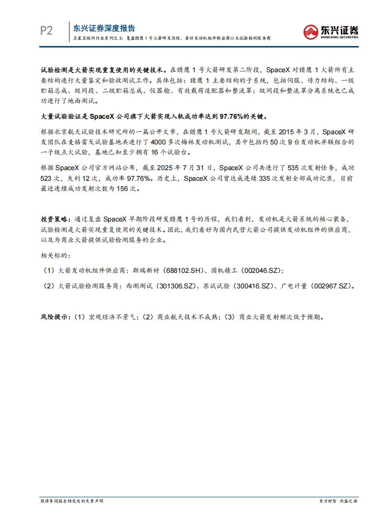 投资策略:通过复盘SpaceX早期阶段研发猎鹰1号的历程,我们看到,发动机是火箭系统的核心装备,试验检测是火箭实现重复使用的关键技术。因此,我们看好为国内民营火箭公司提供发动机组件的供应商,以及为商业火箭提供试验检测服务的企业。