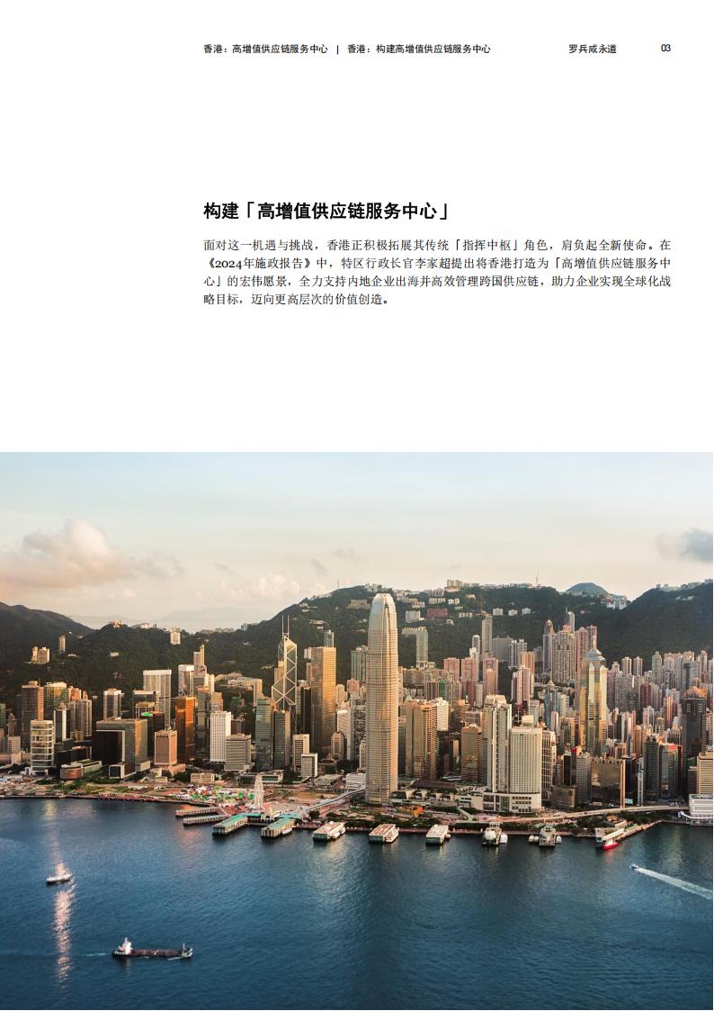 面对这一机遇与挑战,香港正积极拓展其传统「指挥中枢」角色,肩负起全新使命。在《2024年施政报告》中,特区行政长官李家超提出将香港打造为「高增值供应链服务中心」的宏伟愿景,全力支持内地企业出海并高效管理跨国供应链,助力企业实现全球化战略目标,迈向更高层次的价值创造。
