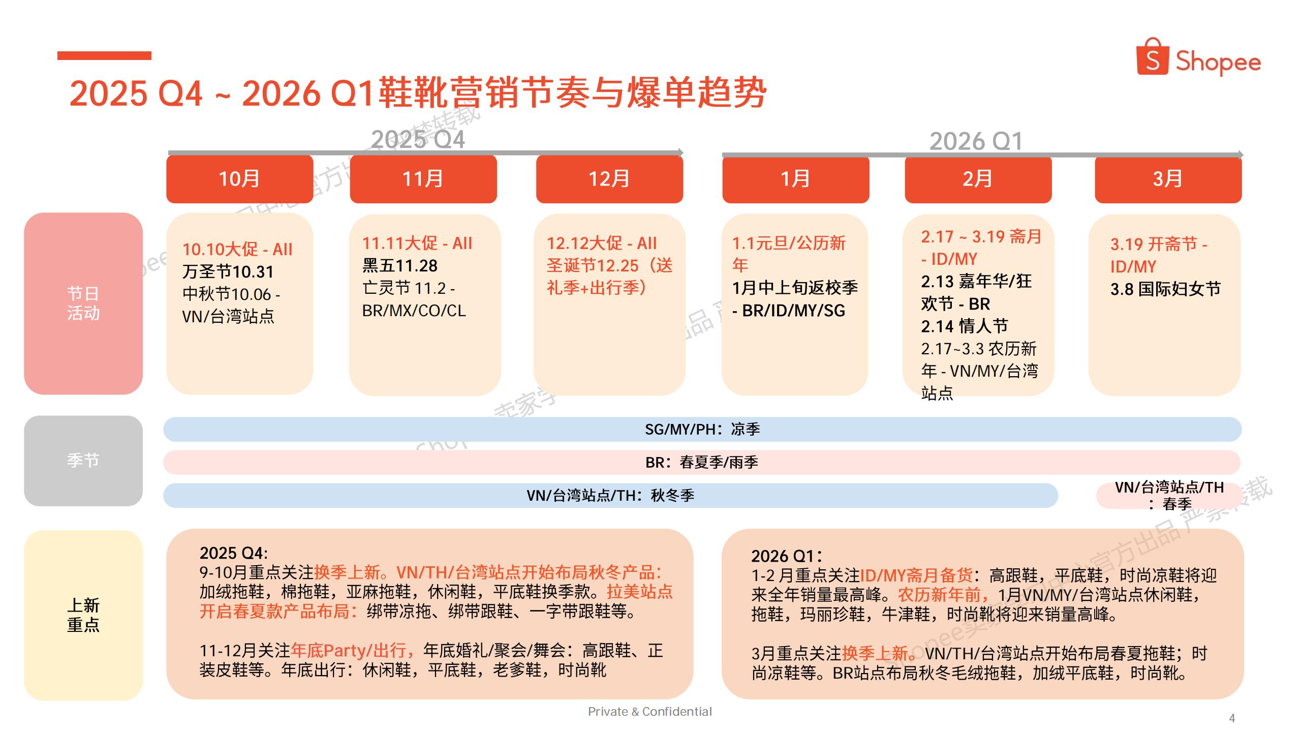 1-2月重点关注ID/MY斋月备货:高跟鞋,平底鞋,时尚凉鞋将迎来全年销量最高峰。农历新年前,1月VN/MY/台湾站点休闲鞋,拖鞋,玛丽珍鞋,牛津鞋,时尚靴将迎来销量高峰。
