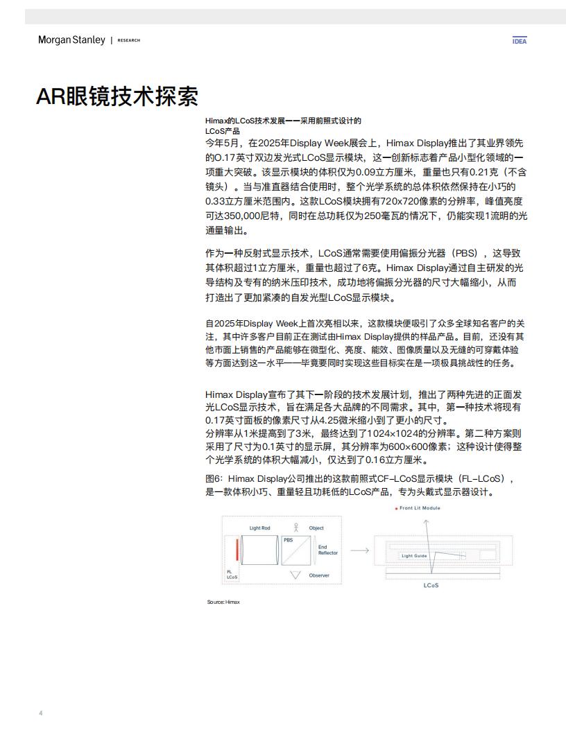2.前照式LCoS显示屏:Himax推出的新款0.17英寸双边照明前照式LCoS显示模块即将投入量产,并已获得了多家知名眼镜品牌的青睐。与旧版本相比,这款显示模块的体积仅为0.09立方厘米,重量也只有0.21克(不包括镜片)。