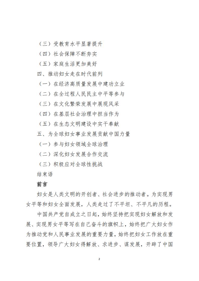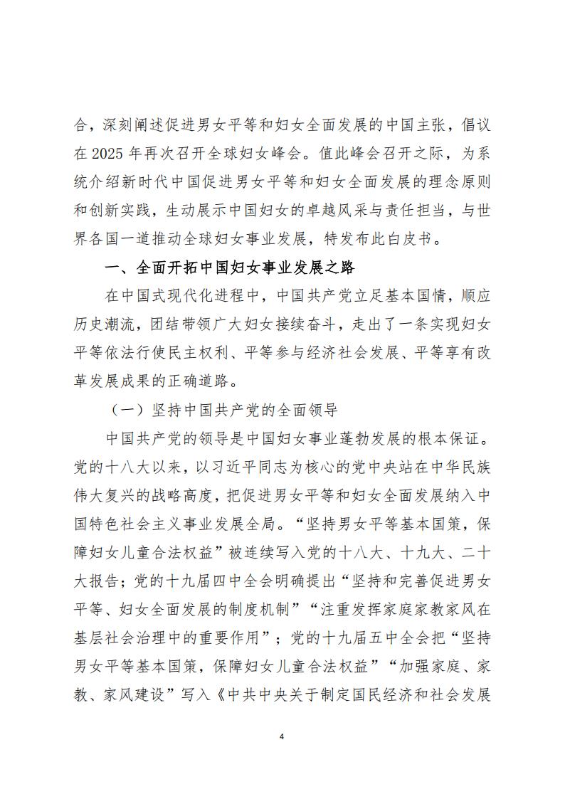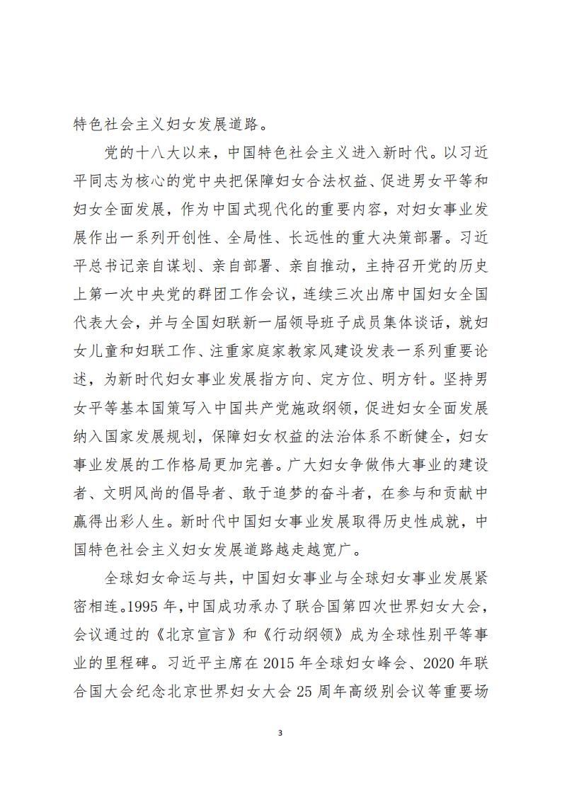 全球妇女命运与共,中国妇女事业与全球妇女事业发展紧密相连。1995年,中国成功承办了联合国第四次世界妇女大会,会议通过的《北京宣言》和《行动纲领》成为全球性别平等事业的里程碑。习近平主席在2015年全球妇女峰会、2020年联合国大会纪念北京世界妇女大会25周年高级别会议等重要场合,深刻阐述促进男女平等和妇女全面发展的中国主张,倡议在2025年再次召开全球妇女峰会。值此峰会召开之际,为系统介绍新时代中国促进男女平等和妇女全面发展的理念原则和创新实践,生动展示中国妇女的卓越风采与责任担当,与世界各国一道推动全球妇女事业发展,特发布此白皮书。