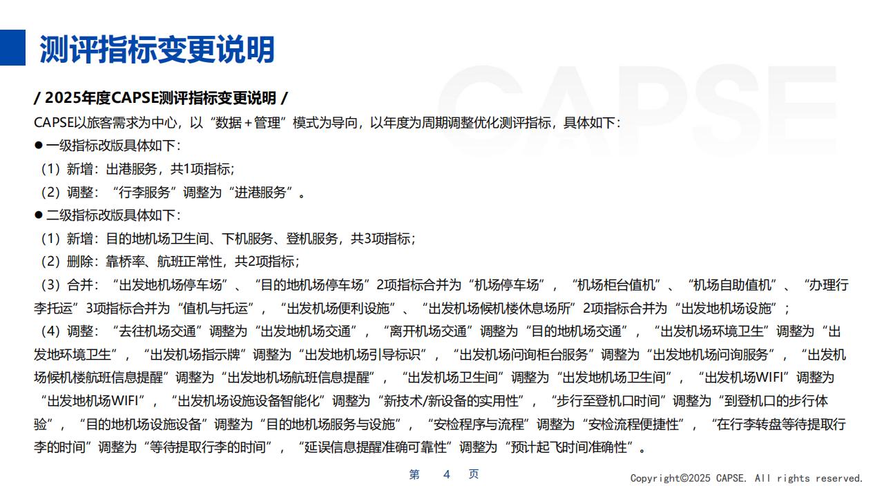CAPSE以旅客需求为中心,以“数据+管理”模式为导向,以年度为周期调整优化测评指标,具体如下: