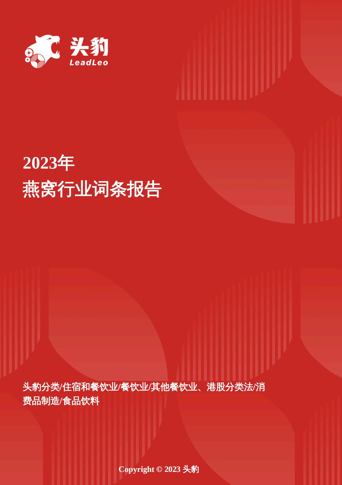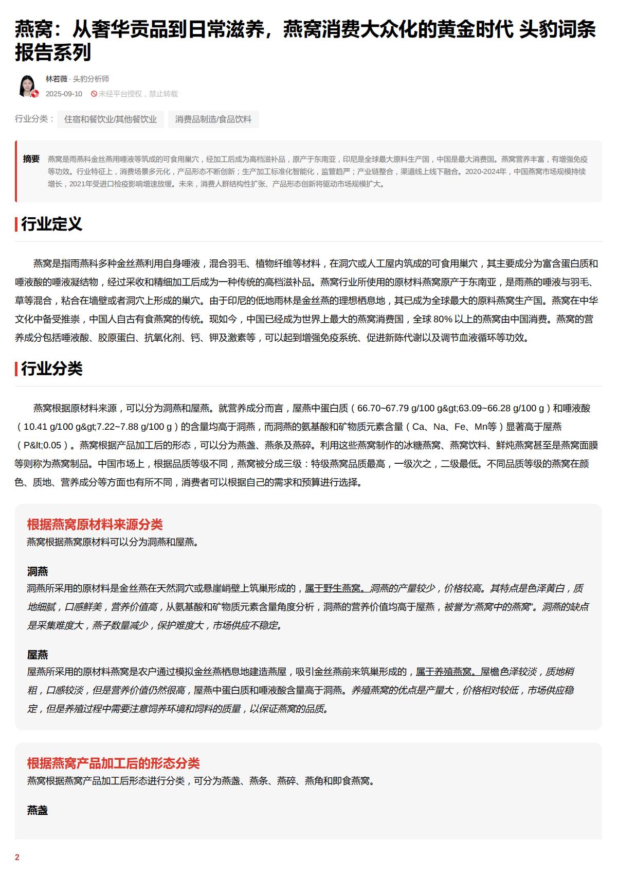摘要 燕案是忑蔬科金丝燕甩唾液等筑成的可食用巢穴,经加工后成为高档滋补品,愿产于东南亚,印尼是全球最大原料生产国,中国是最大消费国,燕窝营养丰富,有增强免疫等功效。行业特征上,消费场景多元化,产品形态不断自断;生产加工标准化智能化,监管趋严;产业链整合,渠道线上线下融合。2020-2024年,中国燕窝市场规模持续增长,2021年受进口检疫影响增速放缓。未来,消费人群结构性扩张.产品形态创新将驱动市场规模扩大。