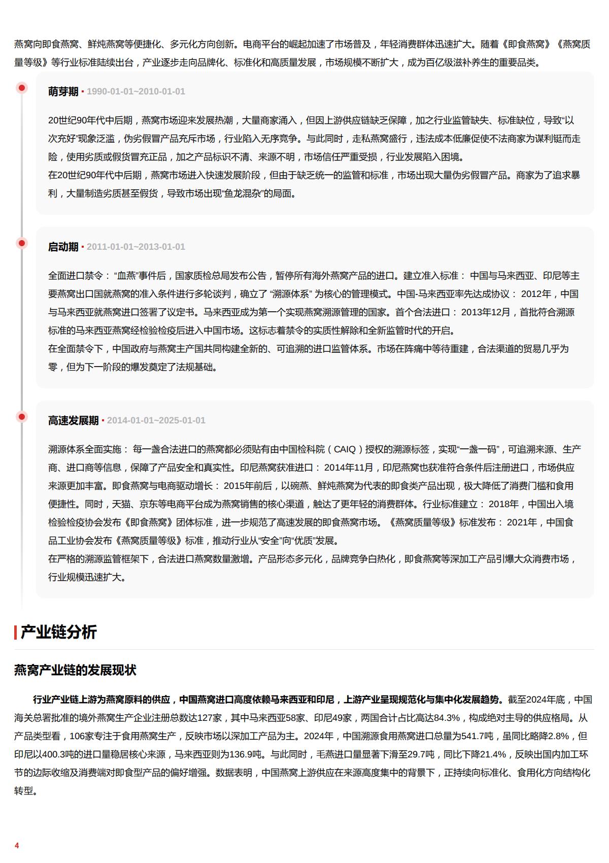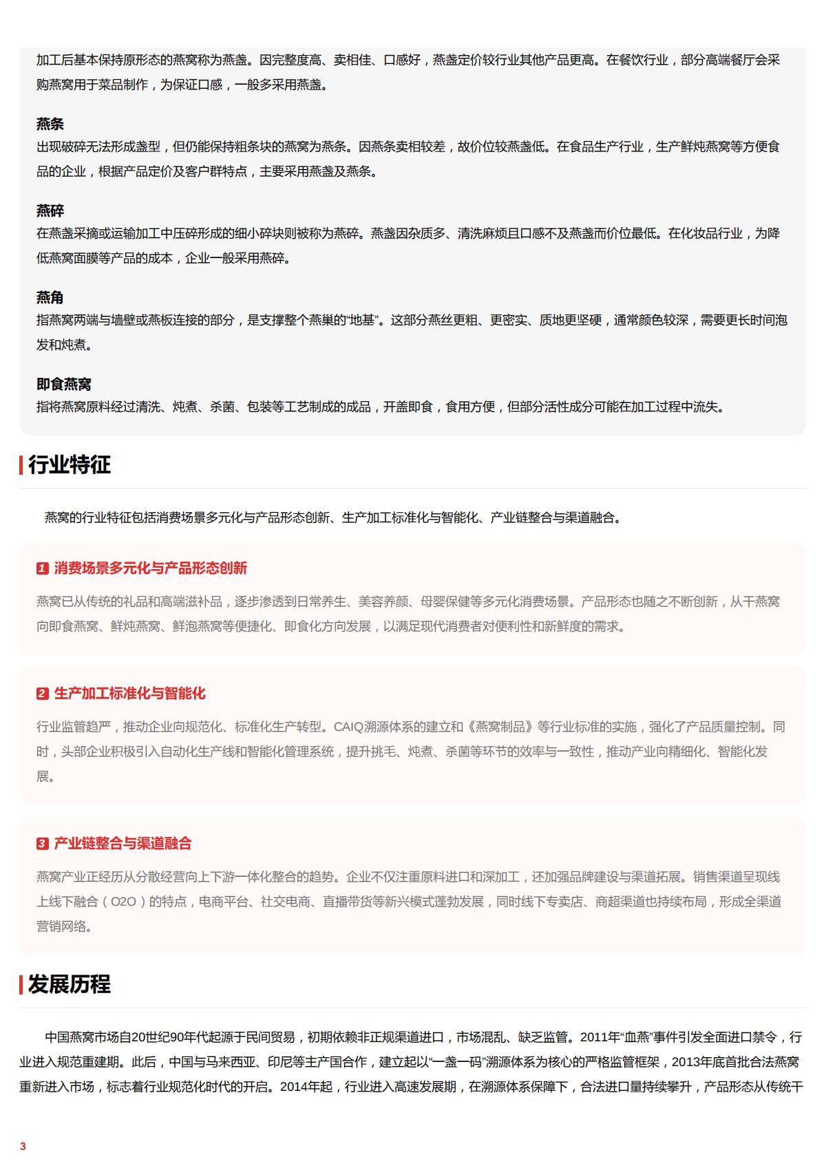 燕窝的行业特征包括消费场景多元化与产品形态创新、生产加工标准化与智能化、产业链整合与渠道融合。1消费场景多元化与产品形态创新燕窝已从传统的礼品和高端滋补品,逐步渗透到日常养生、美容养颜、母婴保健等多元化消费场景。产品形态也随之不断创新,从干燕窝2生产加工标准化与智能化行业监管趋严,推动企业向规范化、标准化生产转型。CAIQ溯源体系的建立和《燕窝制品》等行业标准的实施,强化了产品质量控制。同3产业链整合与渠道融合燕窝产业正经历从分散经营向上下游一体化整合的趋势。企业不仅注重原料进口和深加工,还加强品牌建设与渠道拓展。销售渠道呈现线|发展历程向即食燕窝、鲜炖燕窝、鲜泡燕窝等便捷化、即食化方向发展,以满足现代消费者对便利性和新鲜度的需求。时,头部企业积极引入自动化生产线和智能化管理系统,提升挑毛、炖煮、杀菌等环节的效率与一致性,推动产业向精细化、智能化发上线下融合(020)的特点,电商平台、社交电商、直播带货等新兴模式蓬勃发展,同时线下专卖店、商超渠道也持续布局,形成全渠道展。营销网络。