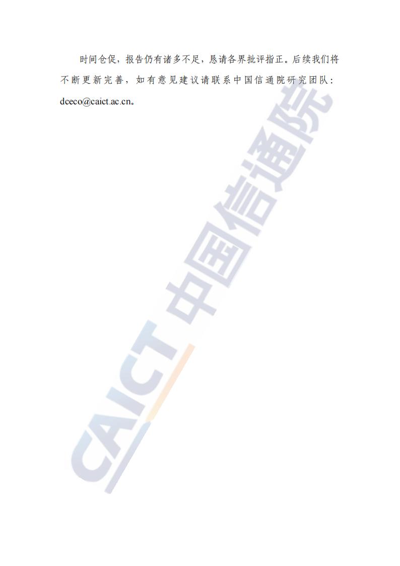 时间仓促,报告仍有诸多不足,恳请各界批评指正。后续我们将不断更新完善,如有意见建议请联系中国信通院研究团队:dceco@caict.ac.cn。