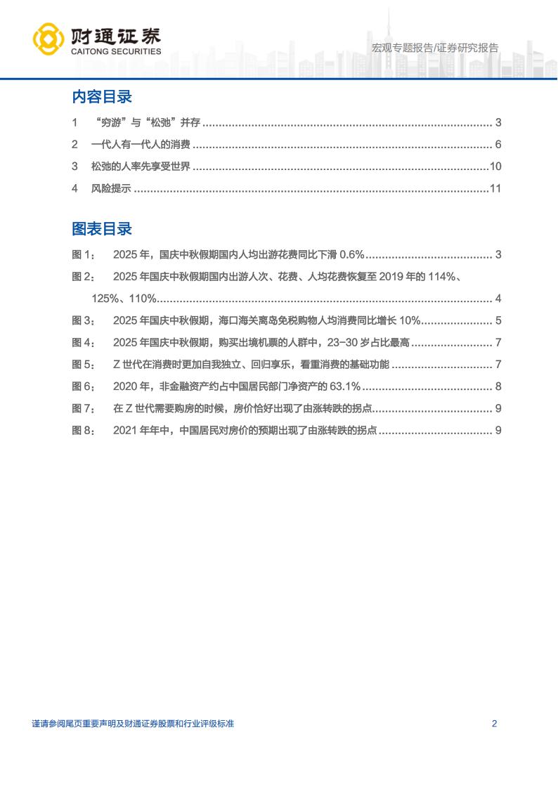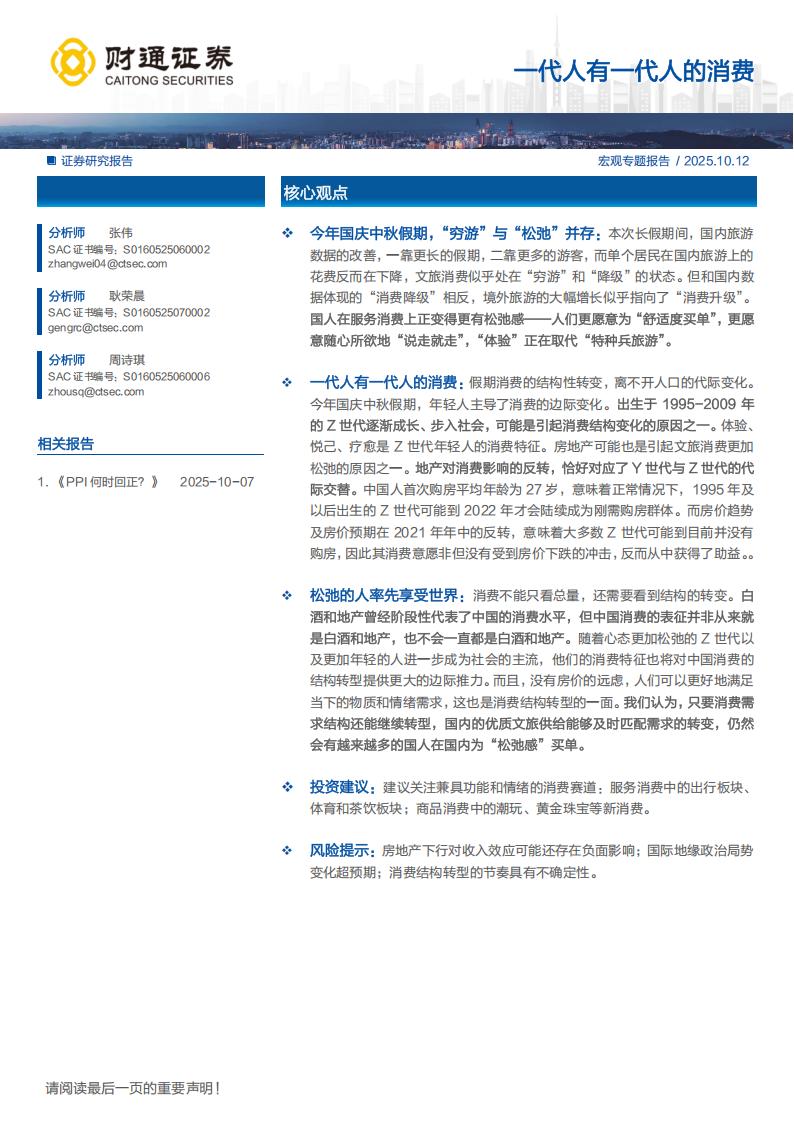 一代人有一代人的消费:假期消费的结构性转变,离不开人口的代际变化。今年国庆中秋假期,年轻人主导了消费的边际变化。出生于1995-2009年的Z世代逐渐成长、步入社会,可能是引起消费结构变化的原因之一。体验、悦己、疗愈是Z世代年轻人的消费特征。房地产可能也是引起文旅消费更加松弛的原因之一。地产对消费影响的反转,恰好对应了Y世代与Z世代的代际交替。中国人首次购房平均年龄为27岁,意味着正常情况下,1995年及以后出生的Z世代可能到2022年才会陆续成为刚需购房群体。而房价趋势及房价预期在2021年年中的反转,意味着大多数Z世代可能到目前并没有购房,因此其消费意愿非但没有受到房价下跌的冲击,反而从中获得了助益。。