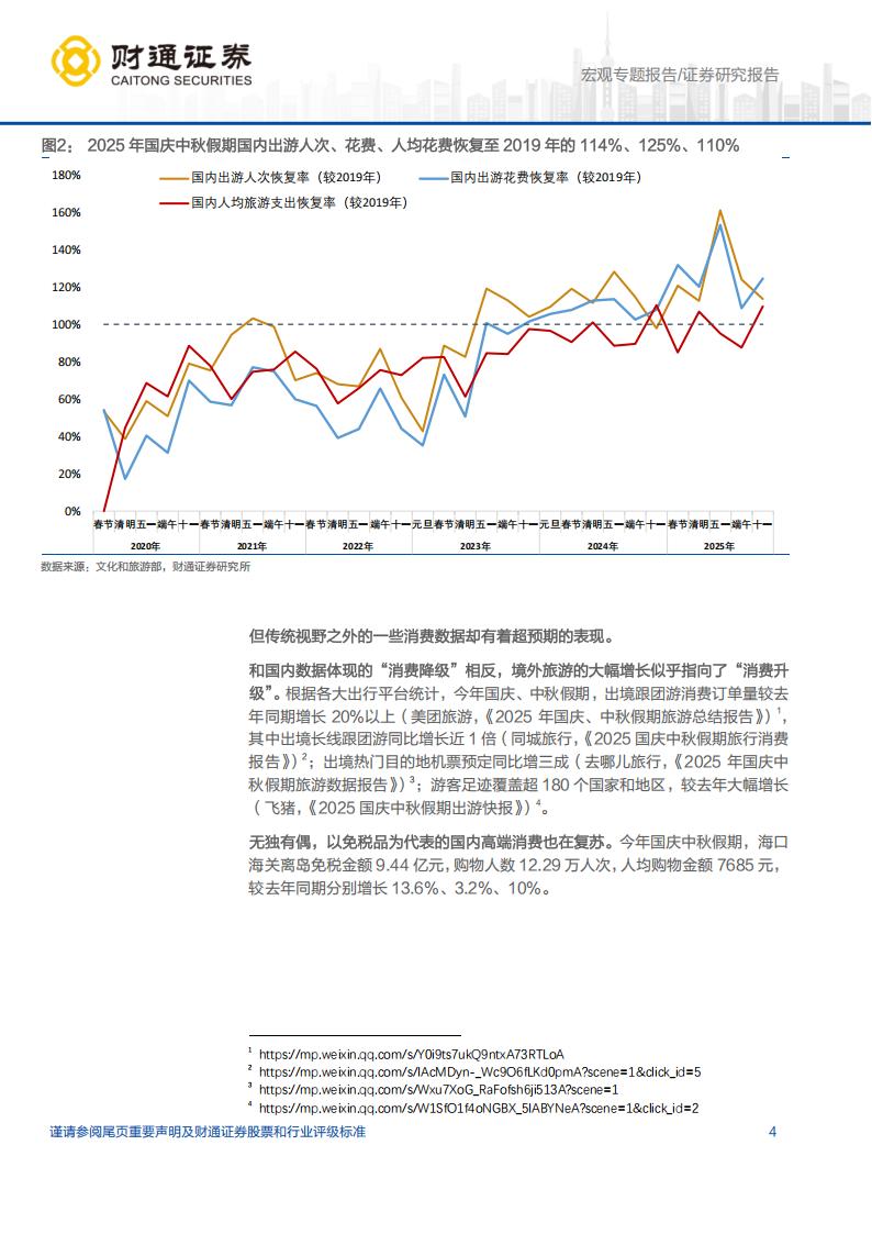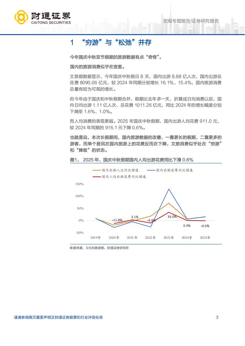 今年国庆中秋假期,“穷游”与“松弛”并存:本次长假期间,国内旅游数据的改善,一靠更长的假期,二靠更多的游客,而单个居民在国内旅游上的花费反而在下降,文旅消费似乎处在“穷游”和“降级”的状态。但和国内数据体现的“消费降级”相反,境外旅游的大幅增长似乎指向了“消费升级”。国人在服务消费上正变得更有松弛感——人们更愿意为“舒适度买单”,更愿意随心所欲地“说走就走”,“体验”正在取代“特种兵旅游”。