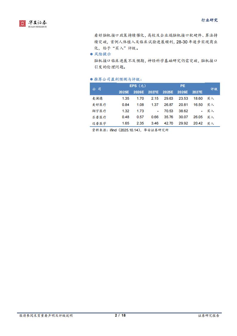 看好脑机接口政策持续催化,高校及企业端脑机接口软硬件、算法持续突破,首例人体植入及临床试验进展顺利,28-30年逐步实现商业化,给予“买入”评级。