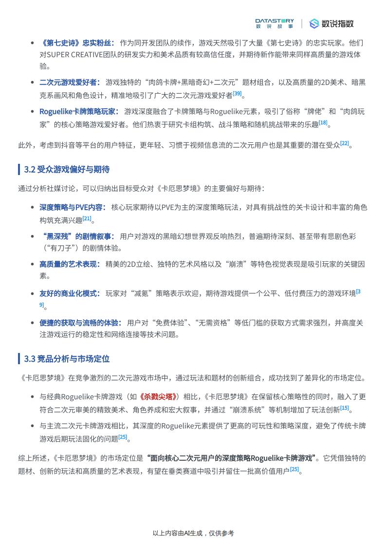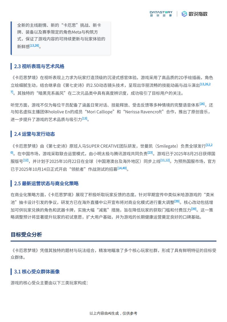 综上所述,《卡厄思梦境》的市场定位是“面向核心二次元用户的深度策略Roguelike卡牌游戏”。它凭借独特的题材、创新的玩法和高质量的艺术表现,有望在垂类赛道中吸引并留住一批高价值用户[25。
