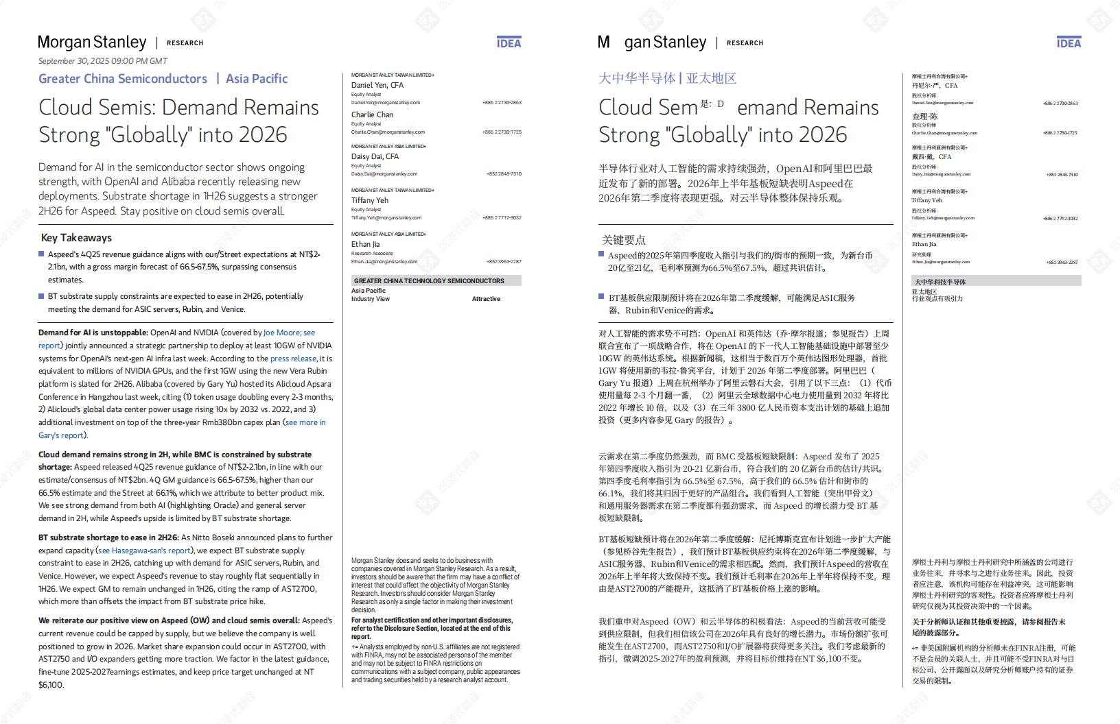 半导体行业对人工暂麓的需求持读强盈,OpenAI和阿里巴巴最近发布了新的部署。2026年上半年基板短缺表明Aspeed在2026年第二季度将表现更强。对云半导体整体保持乐观。