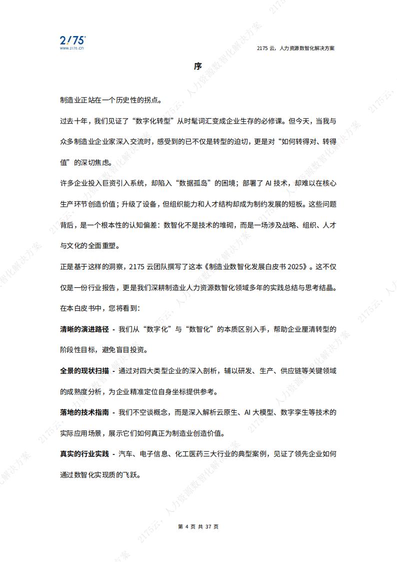 正是基于这样的洞察,2175云团队撰写了这本《制造业数智化发展白皮书2025》。这不仅仅是一份行业报告,更是我们深耕制造业人力资源数智化领域多年的实践总结与思考结晶。在本白皮书中,您将看到: