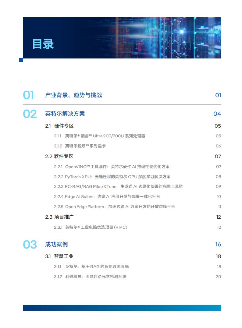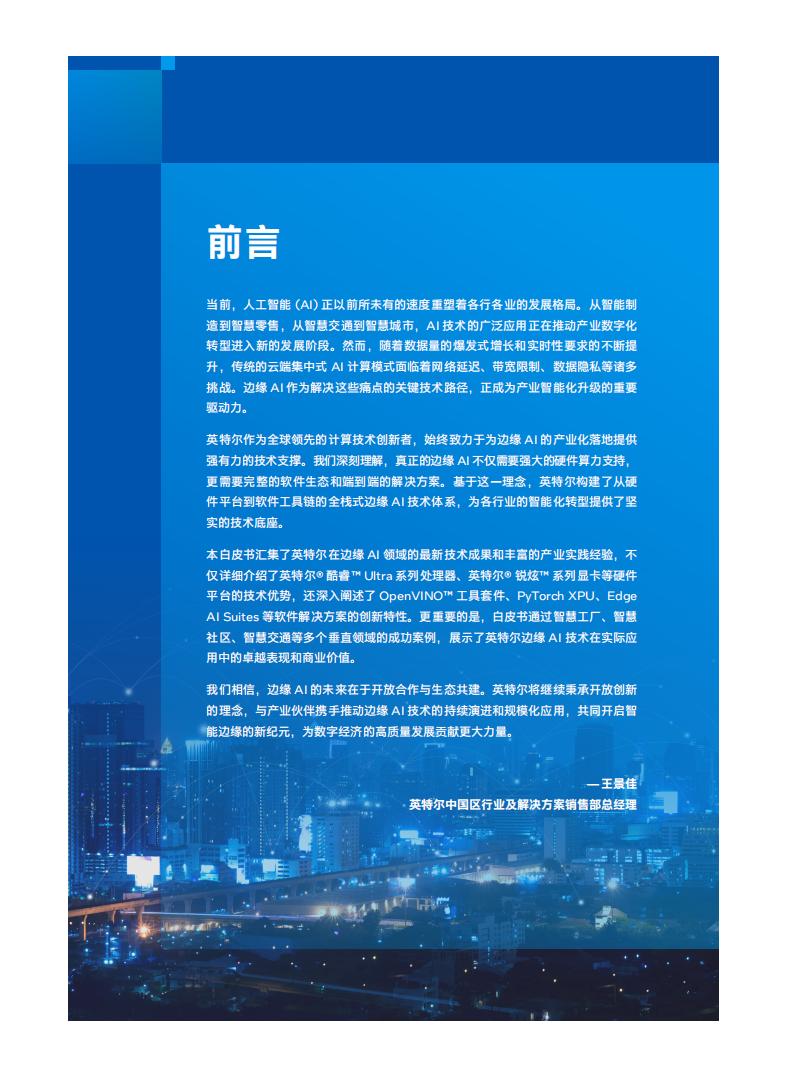 本白皮书汇集了英特尔在边缘Al领域的最新技术成果和丰富的产业实践经验,不仅详细介绍了英特尔◎酷睿TM Ultra系列处理器、英特尔四锐炫9系列显卡等硬件平台的技术优势,还深入阐述了OpenVINO工具套件、PyTorch XPU、EdgeAI Suites等软件解决方案的创新特性。更重要的是,白皮书通过智慧工厂、智慧社区、智慧交通等多个垂直领域的成功案例,展示了英特尔边缘AI技术在实际应用中的卓越表现和商业价值。