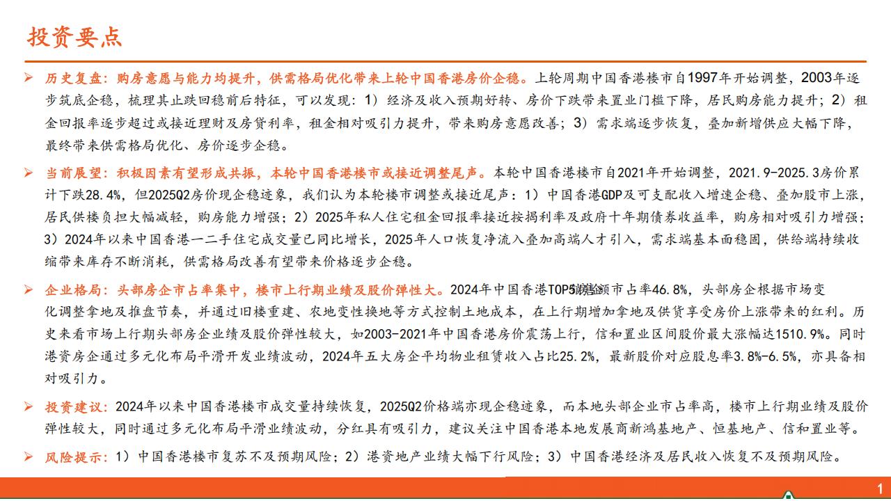 当前展望:积极因素有望形成共振,本轮中国香港楼市或接近调整尾声。本轮中国香港楼市自2021年开始调整,2021.9-2025.3房价累计下跌28.4%,但2025Q2房价现企稳迹象,我们认为本轮楼市调整或接近尾声:1)中国香港GDP及可支配收入增速企稳、叠加股市上涨,居民供楼负担大幅减轻,购房能力增强;2)2025年私人住宅租金回报率接近按揭利率及政府十年期债券收益率,购房相对吸引力增强;3)2024年以来中国香港一二手住宅成交量已同比增长,2025年人口恢复净流入叠加高端人才引入,需求端基本面稳固,供给端持续收缩带来库存不断消耗,供需格局改善有望带来价格逐步企稳。