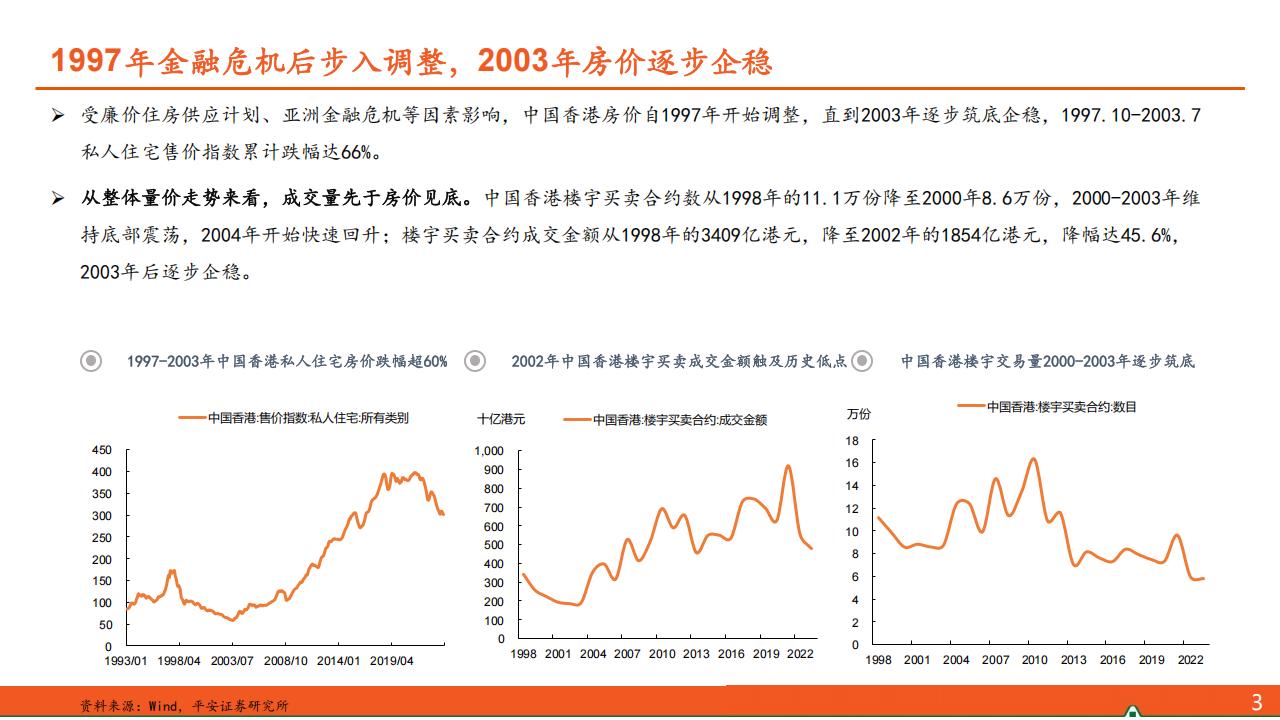 受廉价住房供应计划、亚洲金融危机等因素影响,中国香港房价自1997年开始调整,直到2003年逐步筑底企稳,1997.10-2003.7私人住宅售价指数累计跌幅达66%。